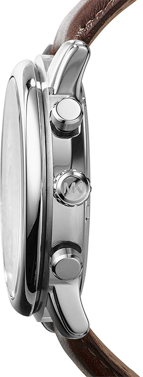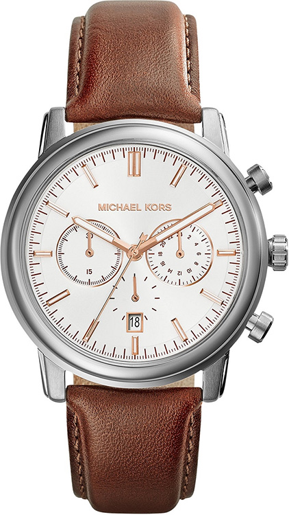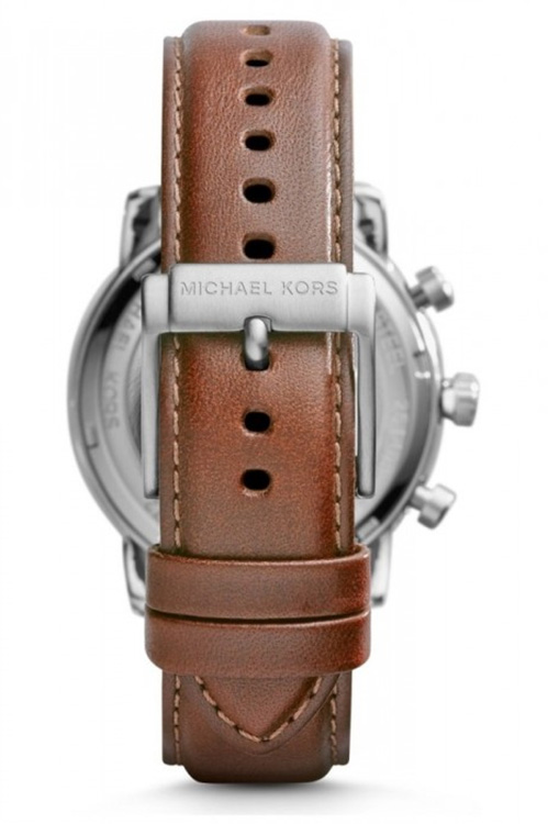 Elegantní pánské hodinky Michael Kors Pennant MK8372 od legendárního návrháře Michaela Korse. Klasické, kulaté ocelové pouzdro se zaoblenými hranami, má tlačítka pro spuštění a reset chronografu, stopky. Světlý ciferník zdobily pozlacené indexy a ručičky, které dokonale ladí s hnědým koženým řemínkem.