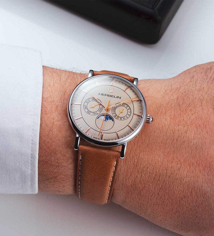 Francouzské hodinky v retro stylu. Michel Herbelin Inspiration ze série Phases de Lune 12747/AP17TR jsou pánské hodinky s kulatým ocelovým pouzdrem. Jasný číselník obsahuje funkci fáze měsíce a dílčí číselníky data s názvem dne v týdnu a dne v měsíci. Vše kryje tvrdé safírové sklíčko odolné proti poškrábání. Na očka pouzdra je připevněn hnědý kožený řemínek s klasickým zapínáním na přezku. Srdcem hodinek je quartzový Machineek Ronda 706, který je napájen baterií. Třída voděodolnosti 3 atmosféry (až 30 metrů) umožňuje bezpečné mytí rukou s hodinkami na zápěstí. Hodinky Inspiration 12747/AP17TR jsou retro model se stopkami, ideální pro muže, kteří oceňují klasické linie.