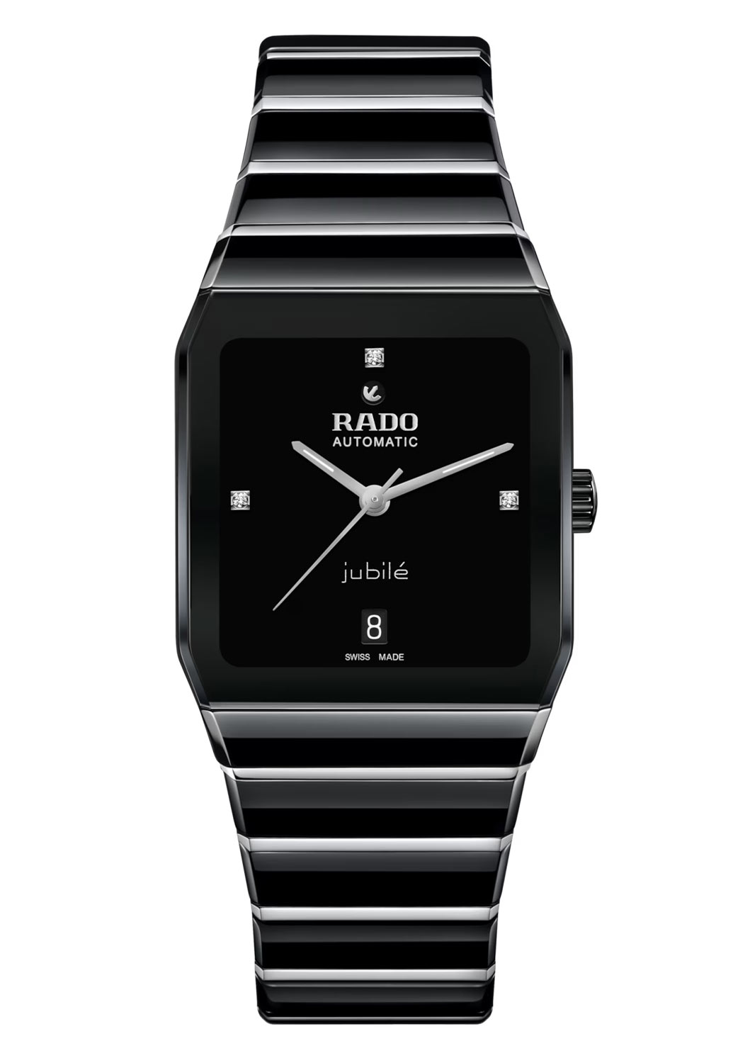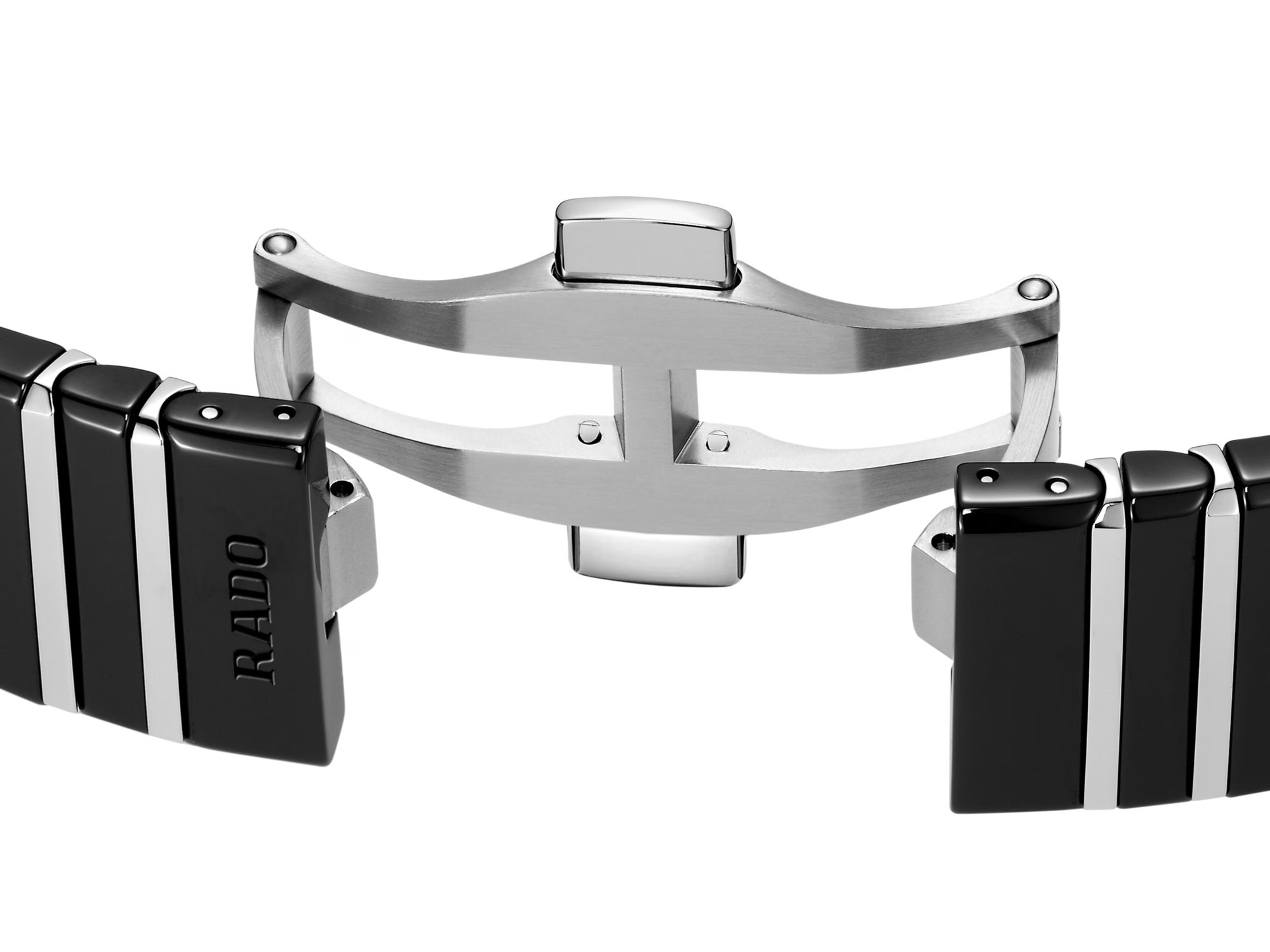 Zepředu jsou keramické hodinky Rado R10201712 kryté válcovým safírovým sklem s antireflexní vrstvou. Černý ciferník je nyní lakovaný a zakončený kartáčovaným povrchem. Aktuální čas ukazují zvětšené ručičky se zářící luminiscenční hmotou. Elegantní indexy a tři oslnivé diamanty jsou zasazeny na celé hodinové body. Pod nápisem "AUTOMATIC" je místo pro datumové okénko. Aktuální den v měsíci je zobrazen na tmavém pozadí. Pod číselníkem je instalován švýcarský strojek Rado - kalibr R766 s automatickým nátahem. Nadšence automatických mechanismů jistě potěší vysoká rezerva chodu až 72 hodin a antimagnetická vlasová pružina Nivachron™. Silikonová pružina chrání mechanismus před magnetizací a vyššími teplotami.