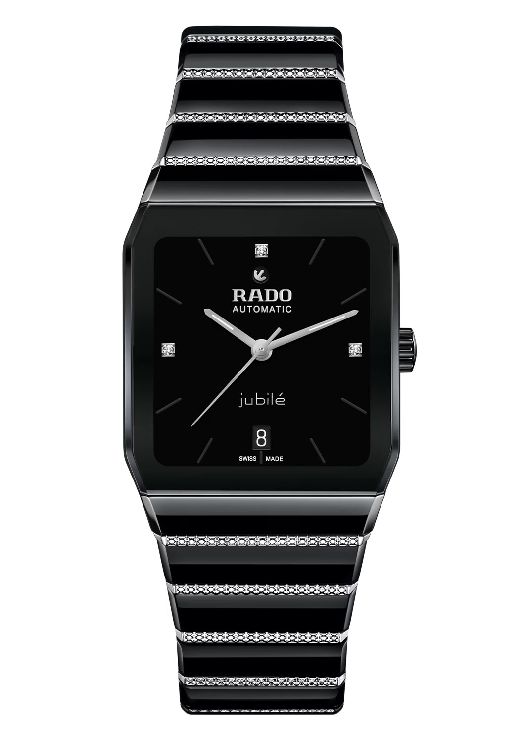 Zepředu jsou keramické hodinky Rado R10204712 kryté válcovým safírovým sklem s antireflexní vrstvou. Černý ciferník je nyní lakovaný a zakončený kartáčovaným povrchem. Aktuální čas ukazují zvětšené ručičky se zářící luminiscenční hmotou. Elegantní indexy a tři oslnivé diamanty jsou zasazeny na celé hodinové body. Pod nápisem "AUTOMATIC" je místo pro datumové okénko. Aktuální den v měsíci je zobrazen na tmavém pozadí. Pod číselníkem je instalován švýcarský strojek Rado - kalibr R766 s automatickým nátahem. Nadšence automatických mechanismů jistě potěší vysoká rezerva chodu až 72 hodin a antimagnetická vlasová pružina Nivachron™. Silikonová pružina chrání mechanismus před magnetizací a vyššími teplotami.