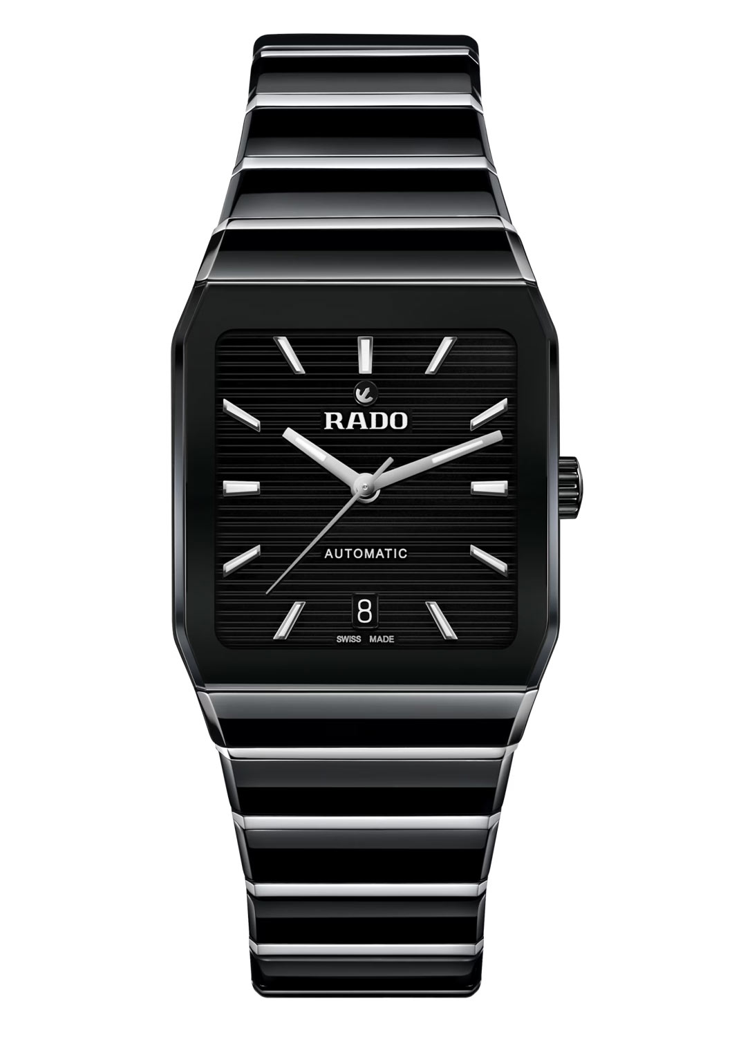 Zepředu jsou keramické hodinky Rado R10201152 kryté válcovým safírovým sklem s antireflexní vrstvou. Černý ciferník je nyní lakovaný a má kartáčovaný povrch. Aktuální čas ukazují zvětšené ručičky se zářící luminiscenční hmotou. Elegantní indexy jsou umístěny na celohodinových bodech. Pod nápisem "AUTOMATIC" je místo pro datumové okénko. Aktuální den v měsíci je zobrazen na tmavém pozadí. Pod číselníkem je instalován švýcarský mechanismus Rado – kalibr R766 s automatickým nátahem. Nadšence automatických mechanismů jistě potěší vysoká rezerva chodu až 72 hodin a antimagnetická vlasová pružina Nivachron™. Silikonová pružina chrání mechanismus před magnetizací a vyššími teplotami.