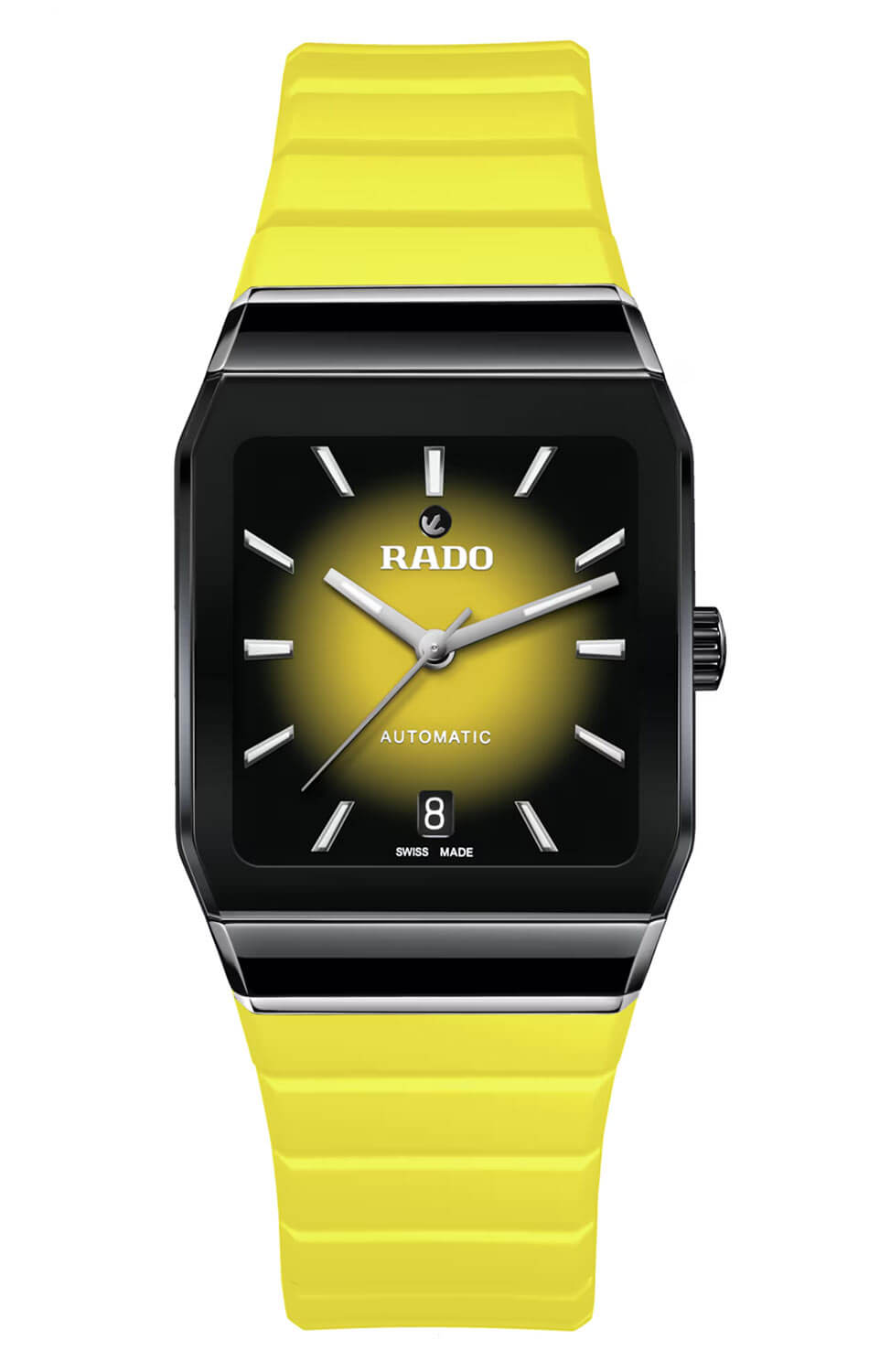 Zepředu jsou keramické hodinky Rado chráněny válcovým safírovým sklem s antireflexní vrstvou. Gradientní žluto-černý ciferník je nyní lakovaný a kartáčovaný. Aktuální čas ukazují zvětšené ručky s luminiscenční vrstvou. Na celých hodinových pozicích jsou umístěny elegantní indexy, které po nasvícení svítí ve tmě. Pod nápisem "AUTOMATIC" se nachází okénko s datem, které zobrazuje aktuální den v měsíci na tmavém podkladu. Pod ciferníkem je umístěn švýcarský strojek Rado — kalibr R766 s automatickým nátahem. Nadšence automatických hodinek potěší vysoká 72hodinová rezerva chodu a antimagnetická vlásková pružina Nivachron™. Křemíková pružina chrání strojek nejen před magnetickými poli, ale také vyššími teplotami.