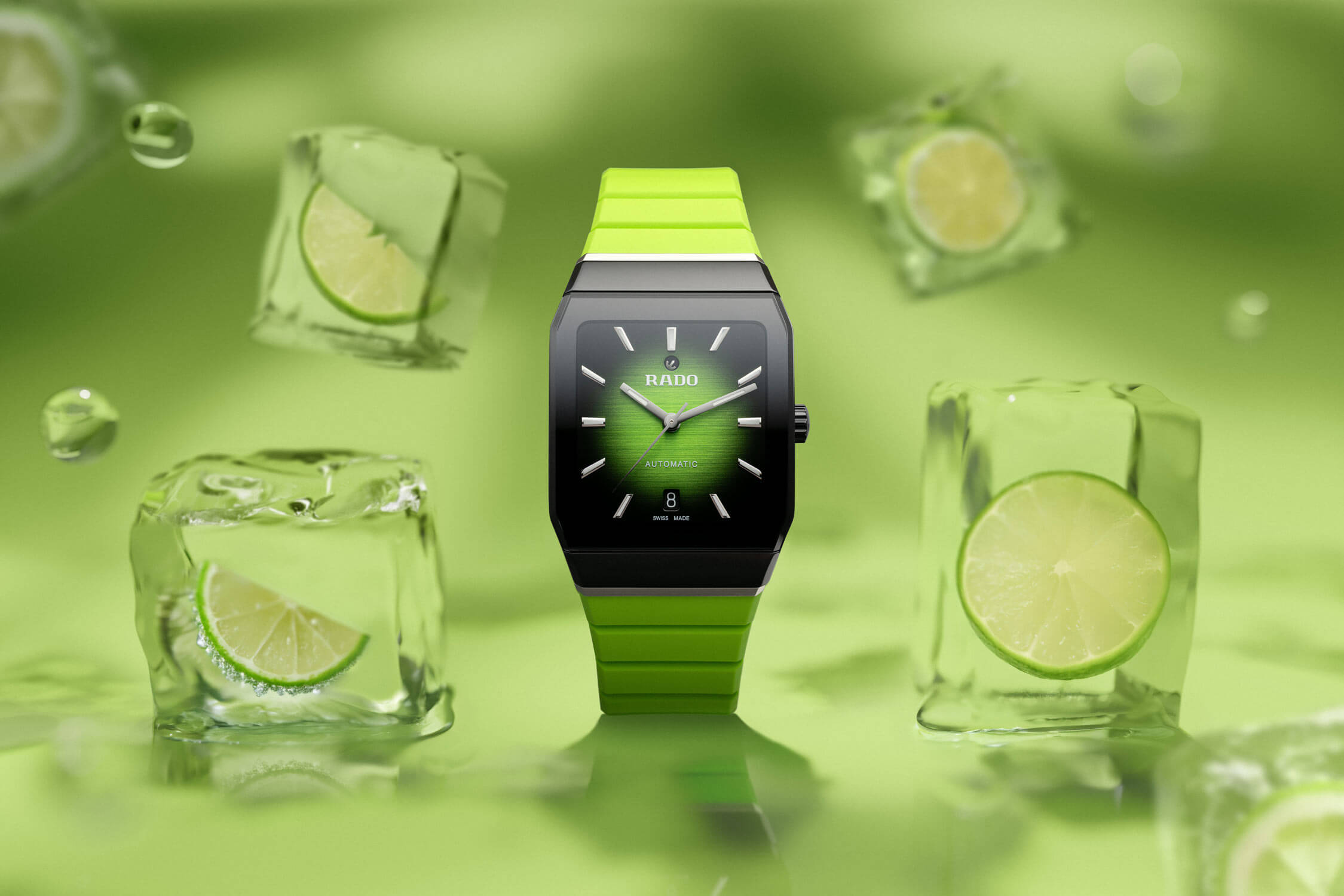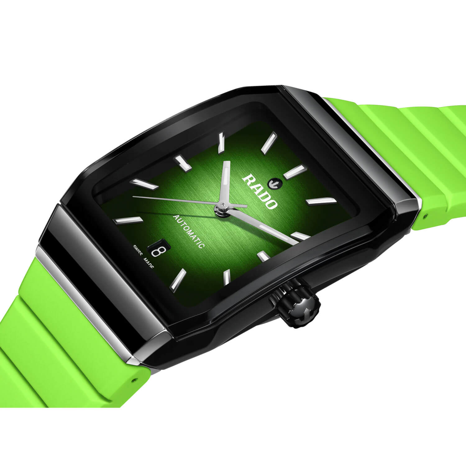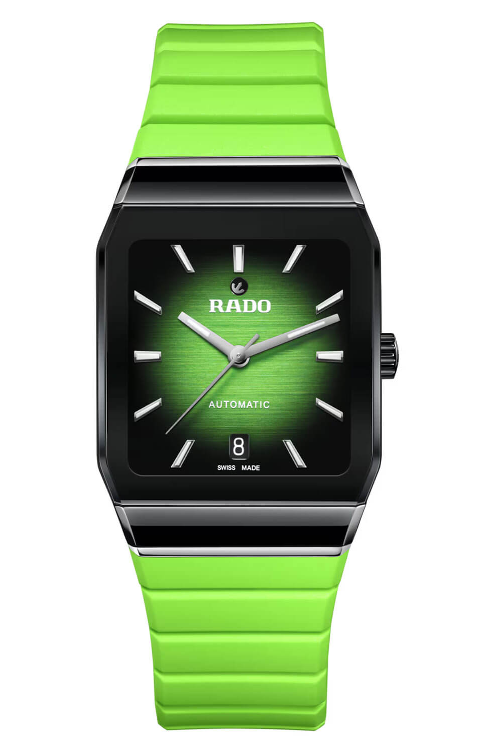 Zepředu jsou keramické hodinky Rado chráněny cylindrickým safírovým sklíčkem s antireflexní vrstvou. Gradientní zeleno-černý ciferník je nyní lakovaný a zdobený kartáčováním. Aktuální čas ukazují zvětšené ručky s luminiscenční vrstvou. Na plných hodinách jsou elegantní indexy, které po nasvícení rovněž svítí ve tmě. Pod nápisem "AUTOMATIC" se nachází datumovka zobrazující aktuální den v měsíci. Pod ciferníkem se nachází švýcarský strojek Rado — kalibr R766 s automatickým nátahem. Milovníky automatických strojků jistě potěší vysoká rezerva chodu až 72 hodin a antimagnetická vlásenka Nivachron™. Křemíková pružina chrání strojek před magnetizací i vyššími teplotami.