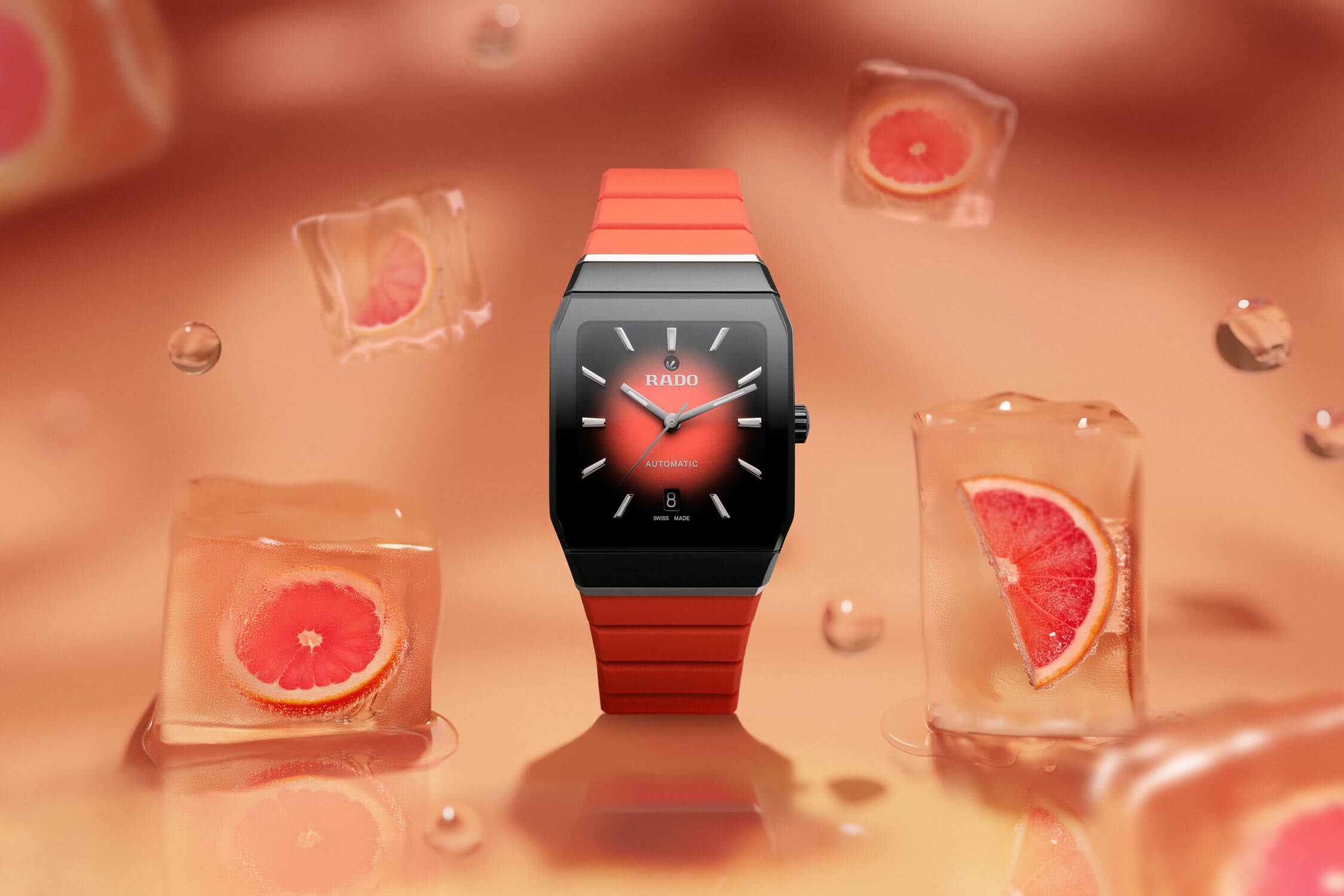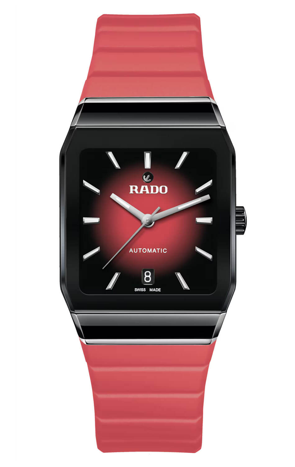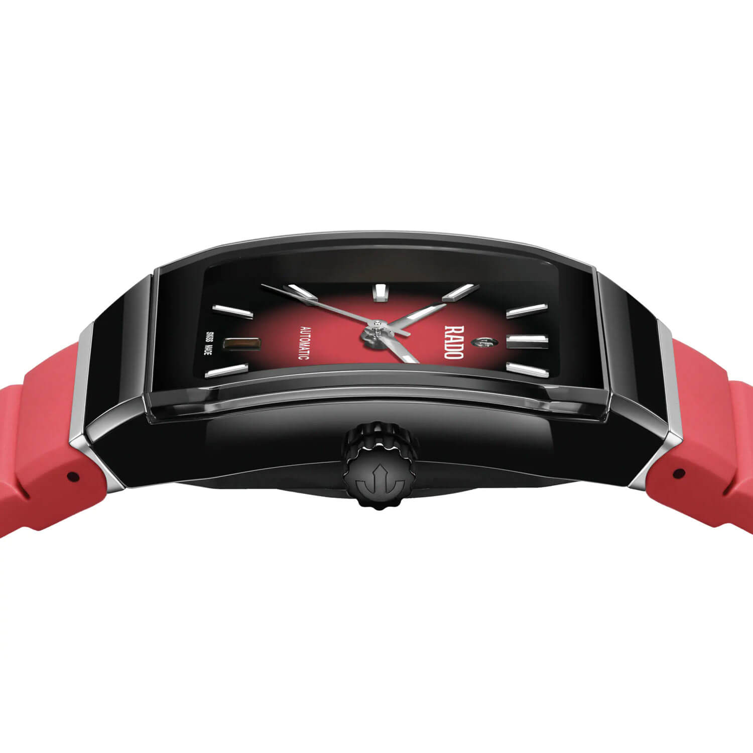 Z přední strany jsou keramické hodinky Rado chráněny válcovým safírovým sklem s antireflexní vrstvou. Gradientní oranžovo-černý číselník je nyní lakovaný a opatřený kartáčovanou úpravou. Aktuální čas ukazují zvětšené ručky s luminiscenční výplní. Na hodinových pozicích jsou elegantní indexy, které také svítí ve tmě po předchozím nasvícení. Pod nápisem „AUTOMATIC“ se nachází datumové okénko s aktuálním dnem měsíce na tmavém podkladu. Pod číselníkem pracuje švýcarský strojek Rado — kalibr R766 s automatickým nátahem. Nadšence automatických strojků potěší vysoká rezerva chodu až 72 hodin a antimagnetická vlásenka Nivachron™. Křemíková vlásenka chrání strojek nejen před magnetickým polem, ale i před vyššími teplotami.