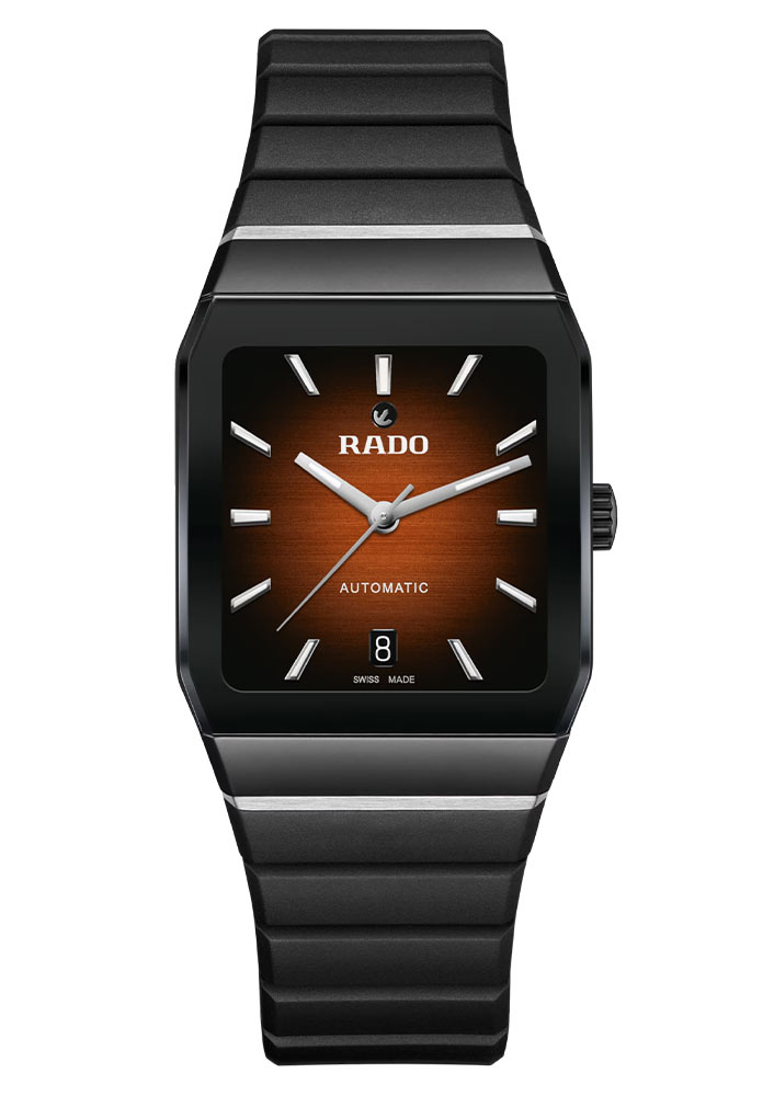 Z přední strany jsou hodinky Rado kryté válcovým safírovým sklem s antireflexní vrstvou. Přechodový hnědý a černý ciferník je nyní lakovaný a kartáčovaný. Aktuální čas ukazují zvětšené ručičky se zářící luminiscenční hmotou. Elegantní indexy jsou umístěny na celohodinových tečkách, které po vystavení světlu také svítí ve tmě. Pod nápisem "AUTOMATIC" je místo pro datumové okénko. Aktuální den v měsíci je zobrazen na tmavém pozadí. Pod číselníkem je instalován švýcarský mechanismus Rado - kalibr R766 s automatickým nátahem. Nadšence automatických mechanismů jistě potěší vysoká rezerva chodu až 72 hodin a antimagnetická vlasová pružina Nivachron™. Silikonová pružina chrání mechanismus před magnetizací a vyššími teplotami.