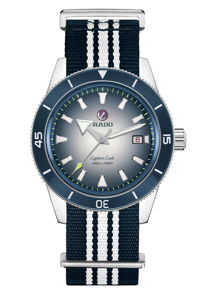 Gradientní, bílo-modrý ciferník obsahuje 12 indexů, hodinovou a minutovou ručku s osvětlenými hroty - díky luminiscenční hmotě Super-LumiNova® nebude čtení času za zhoršených světelných podmínek problém. Charakteristická pohyblivá ochranná známka v podobě kotvy, známá po celém světě, je umístěna na 12. hodině, odkazující na originál z roku 1962. Kotva původně hodinky nejen zdobila, ale sloužila i jako indikátor zdraví mechanismu - když se přestal volně otáčet na ložisku, signalizoval nutnost servisu mechanismu.