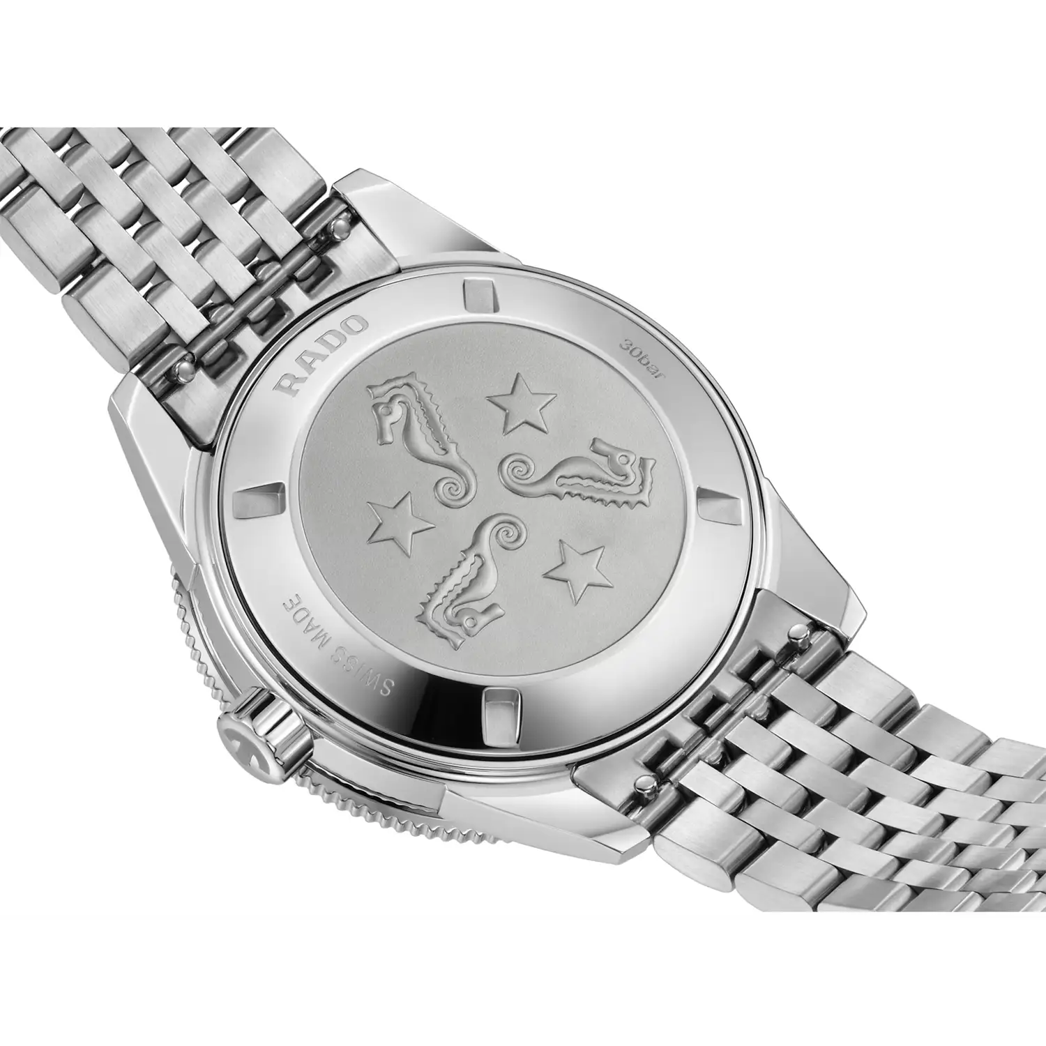 Pouzdro o průměru 39 mm je vyrobeno z leštěné nerezové oceli a doplněno otočnou lunetou s keramickou vložkou, odolnou proti poškrábání a zdobenou trojúhelníkovým markerem Super-LumiNova®. Hodinky Rado Automatic R32223408 si zachovávají vodotěsnost do 300 metrů, přičemž šroubovací korunka a robustní víko zaručují bezpečnost i při intenzivním potápění. Vypouklé safírové sklo kalené při extrémně vysoké teplotě a opatřené oboustrannou antireflexní vrstvou zajišťuje vynikající čitelnost číselníku za všech podmínek. Celek doplňuje náramek z jemných ocelových článků s bezpečnou trojitou motýlkovou sponou. Prezentovaný model se může pochlubit bohatým vybavením. Náramek lze vyměnit za textilní řemínek, který se osvědčí při fyzických aktivitách, nebo za kožený řemínek vhodný pro formálnější příležitosti. Dva řemínky jsou součástí balení.
