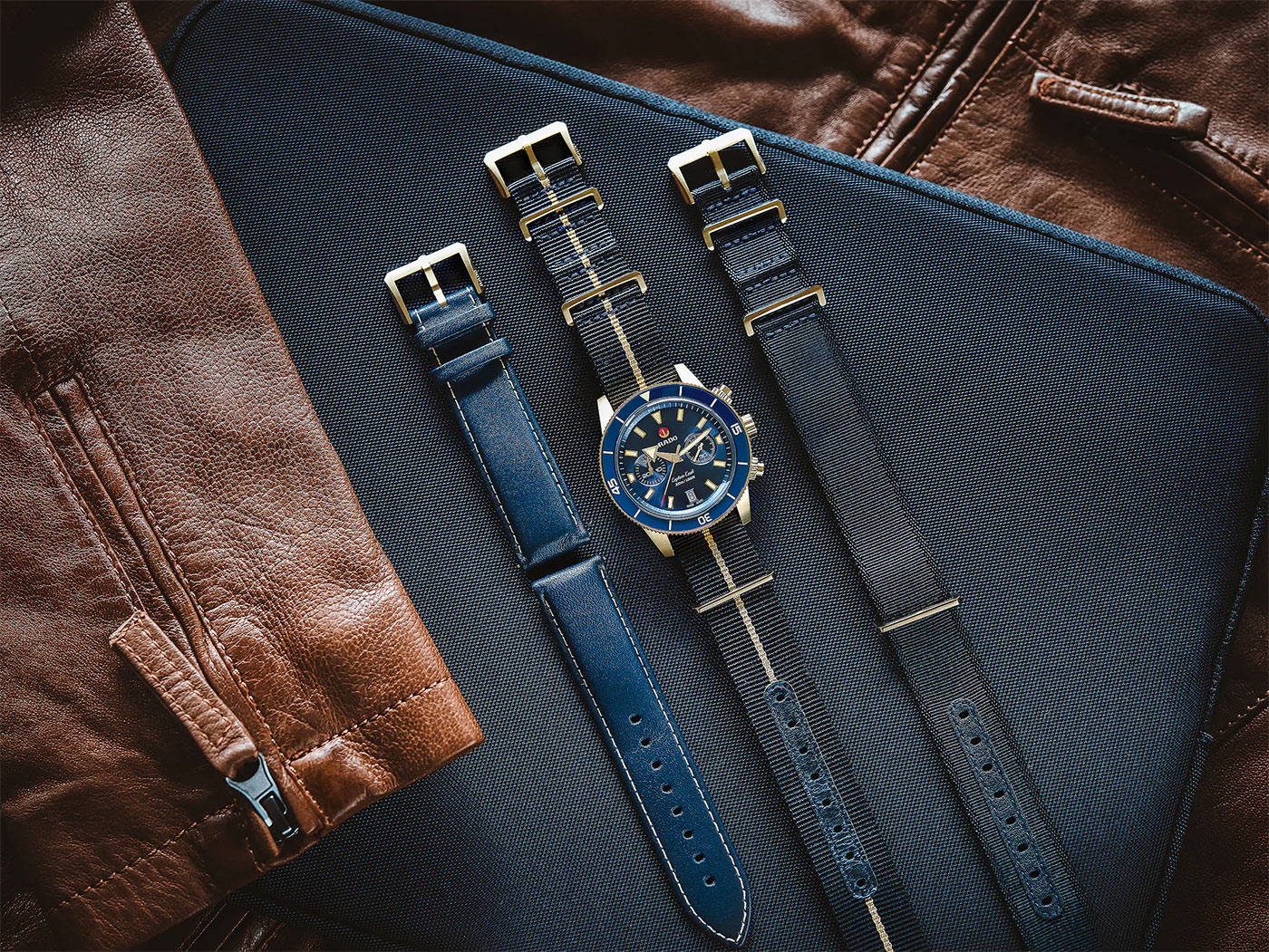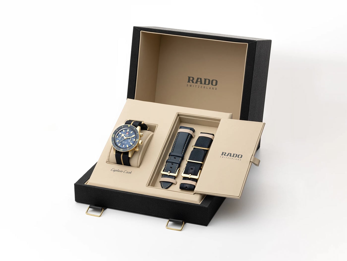 Nový Captain Cook Chronograph je stejně elegantní a plný charakteru jako vždy se dvěma dalšími pásky z různých materiálů a odstínů. Model je proto dodáván s továrním nylonovým sportovním řemínkem NATO stylu se zlatým středovým pruhem, přídavným jednobarevným nylonovým řemínkem a modrým koženým řemínkem se zlatým prošíváním. Aby to bylo vše pohromadě, nový automatický řemínek NATO chronograf Rado Captain Cook přichází s jedinečným pouzdrem vyrobeným tak, aby vydrželo, inspirované dvojitými řemínky pokladnicemi historických průzkumníků a navigátorů. Dřevěná krabička (FSC) , chráněná odolnou nylonovou skořepinou, je zdobena kovovým kováním a její vnitřek z měkké slonoviny umožňuje bezpečné uložení náhradních řemínků a hodinek Rado, když je nenosíte. Hodinky a přídavné řemínky jsou vybaveny pohodlným systémem EasyClip . Umožňuje rychlou a bezproblémovou výměnu řemínků v závislosti na aktuální potřebě uživatele nebo konkrétní příležitosti.