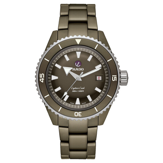 Diver Rado Diver R32130312 s certifikací ISO 6425 je voděodolný do 300 metrů/30 barů. Ručičky a indexy jsou vyplněny vrstvou SuperLuminova®, díky které dokonale vyniknou na hlubokém pozadí vytvořeném zeleným ciferníkem s matným povrchem. Jednodílné pouzdro (monoblok konstrukce) o průměru 43 mm je vyrobeno z matné high-tech keramiky v olivově zelené barvě a otočná luneta je vyrobena z tvrzené nerezové oceli s lesklou povrchovou úpravou. Automatický Machineek Rado R763 překonává standardní testy přesnosti o pět celých bodů a má rezervu chodu 80 hodin. Výše uvedené pánské diverské hodinky Rado jsou dodávány se zeleným high-tech keramickým náramkem. Bez ohledu na to, co se chystáte prozkoumat, hodinky Rado Captain Cook High-Tech Ceramic Diver se stanou vaším spolehlivým a osvědčeným společníkem na mnoho let.
