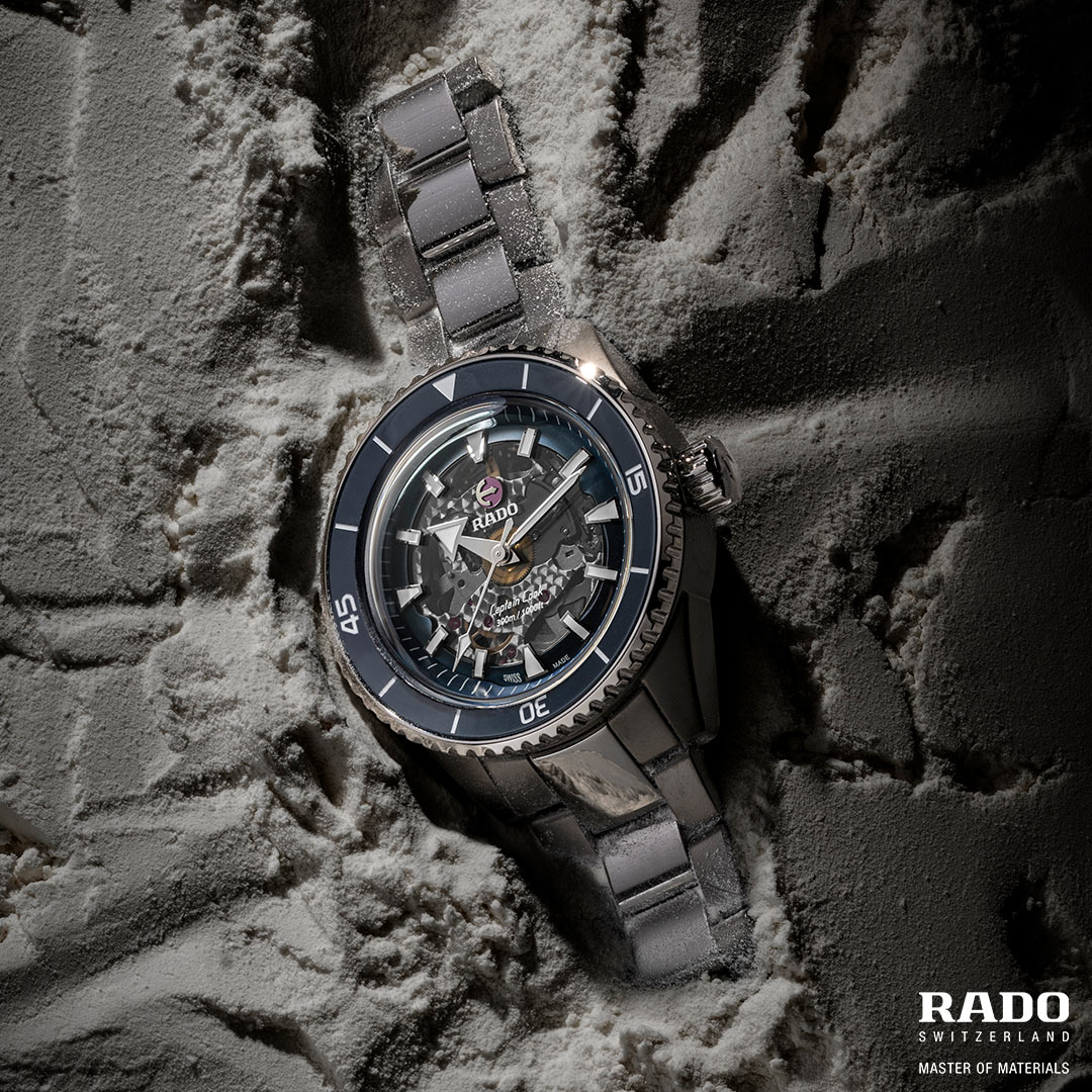 Rado Captain Cook High-Tech Ceramic R32128202 se vyznačuje jedním z nejušlechtilejších počinů značky. Inovativní a technologicky vyspělá konstrukce monoblokového krytu. Nepoškrábaná, hypoalergenní a příjemná na dotek a neztrácející lesk zevnitř, nadpozemsky high-tech plazmová keramika Ceramos™, jejíž neuvěřitelná barva byla získána bez použití kovu a díky plynům aktivovaným při 20 000 °C. Prémiový Machineek s inovativní vlásenkou Nivachron™, která chrání hodinky před magnetickým polem. Uživatel má možnost obdivovat jeho práci jak díky skeletovému ciferníku, tak zadní části pouzdra ze safírového skla, které je voděodolné do cca 300 m.