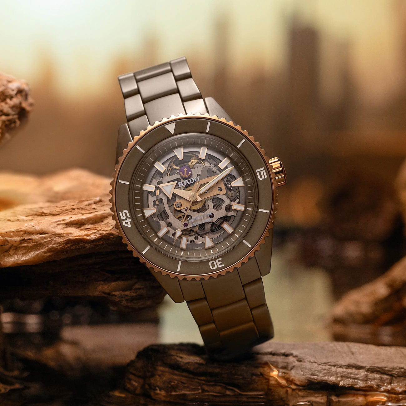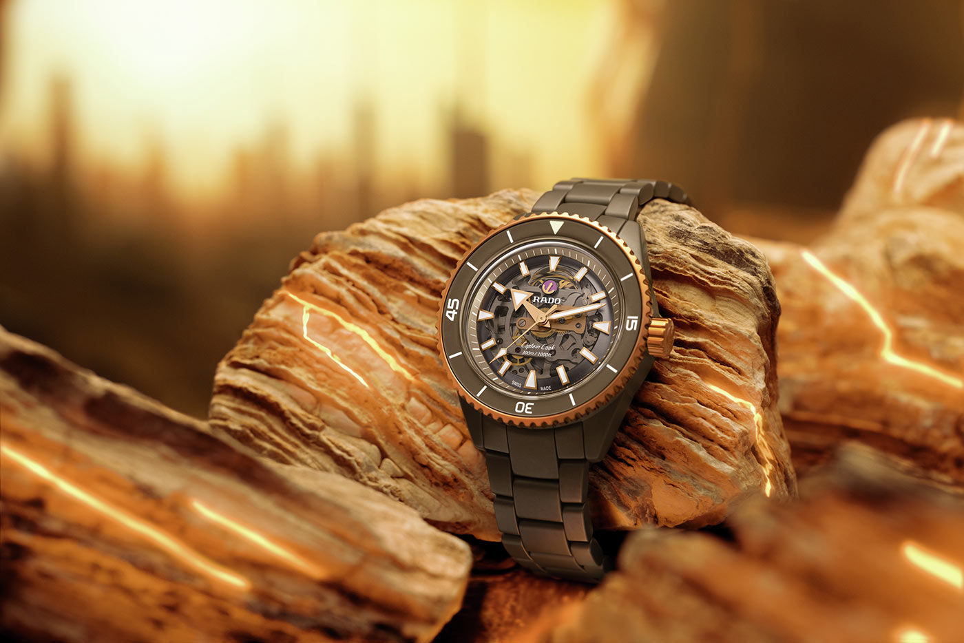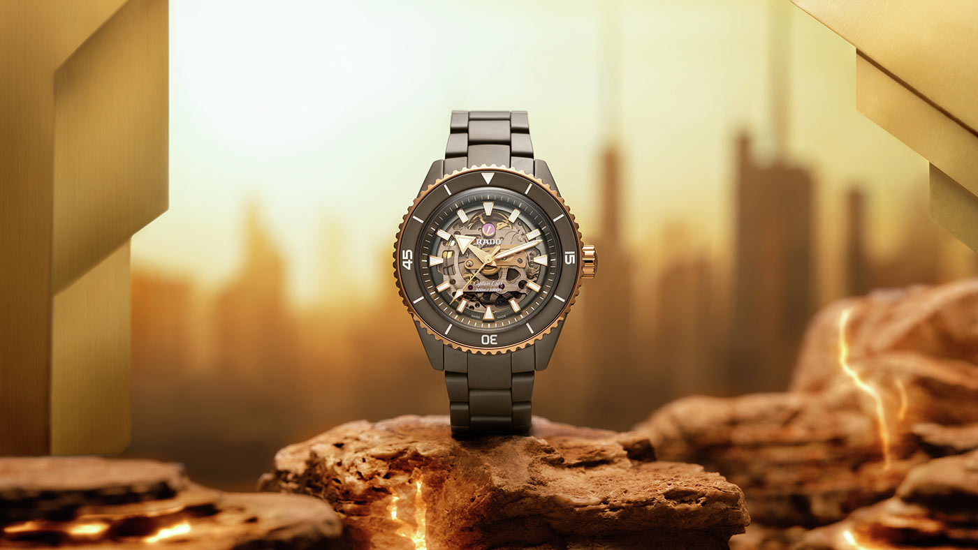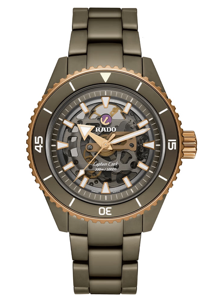 Diverské hodinky Rado Captain Cook High-Tech Ceramic Skeleton mají kulaté pouzdro o průměru 43 mm vyrobené výhradně z High-Tech keramiky v šedé barvě. Hodinky jsou utěsněny na 300 metrů, což vám umožní potápět se bez obav z poškození jejich mechanismu. Přední stranu pouzdra tvoří otočná luneta s indexy a minutovou stupnicí, která vám pomůže sledovat ubíhající čas například při potápění. Luneta je pozlacená a má šedý keramický kroužek. Na pravou stranu umístil výrobce snadno ovladatelnou růžovo-zlatou šroubovací korunku. Značka Rado spárovala své luxusní hodinky s keramickým náramkem s titanovou motýlkovou sponou. Pokročilý keramický materiál zajišťuje příjemný dotek, lehkost a odolnost při používání.