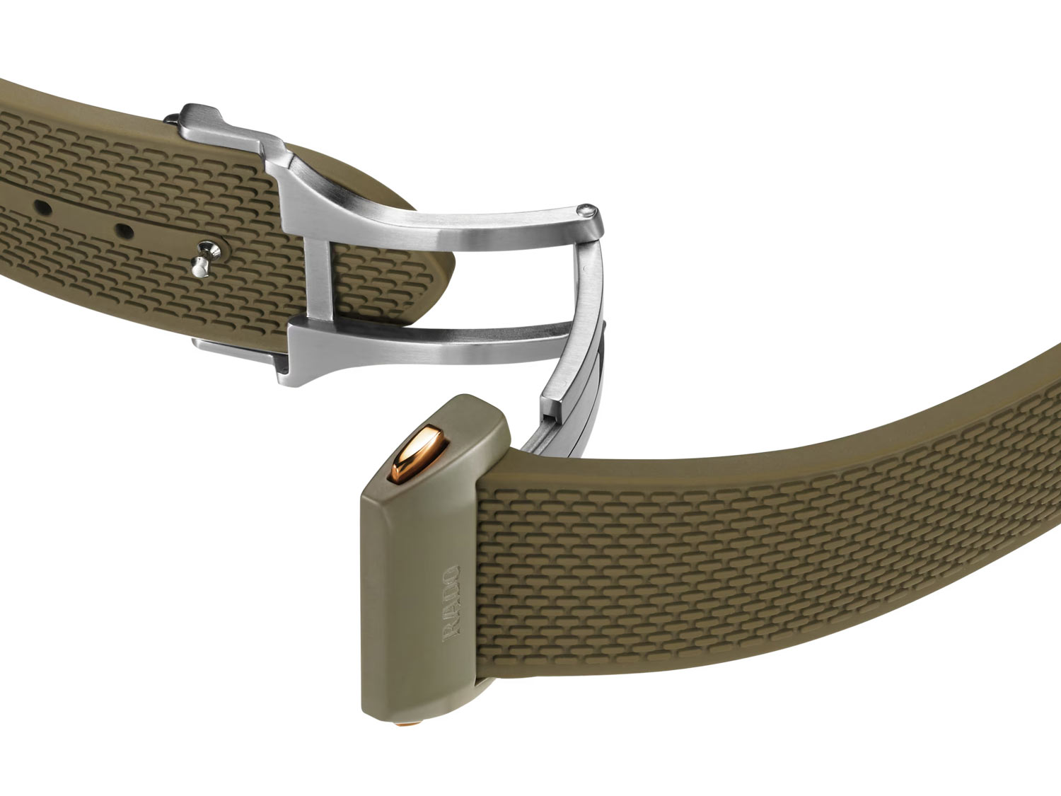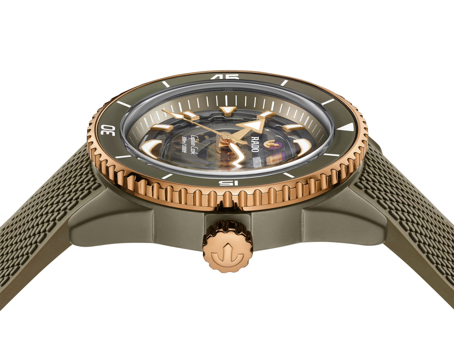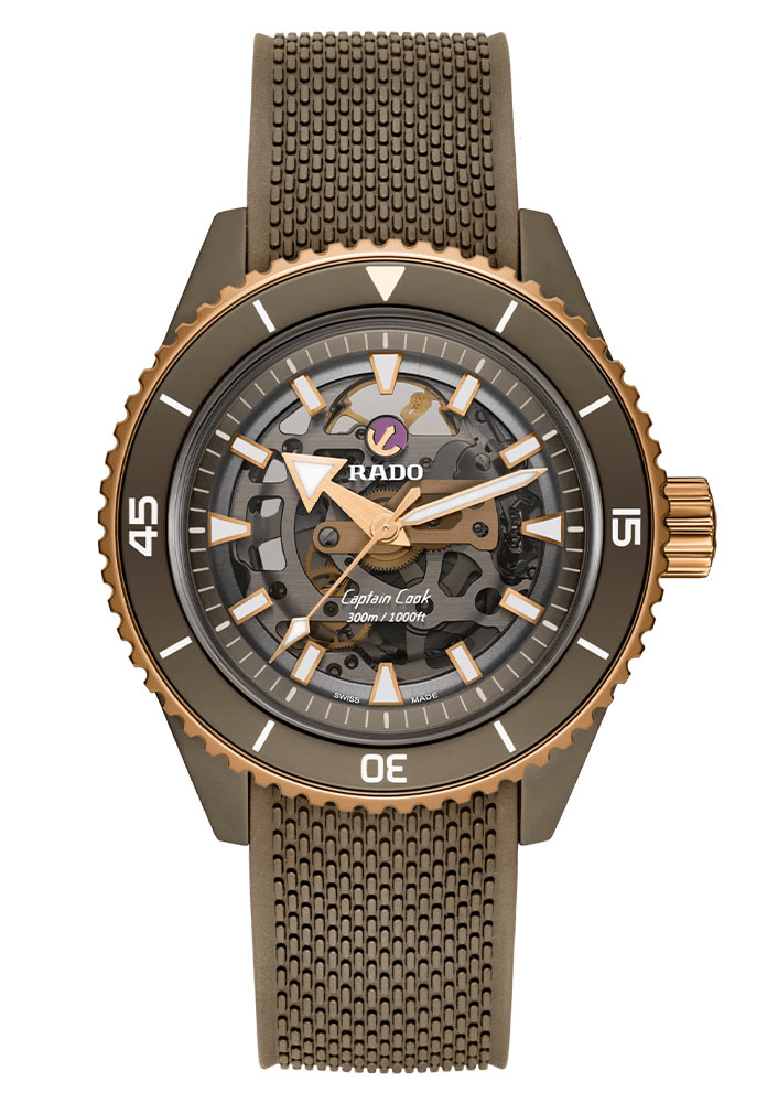 Diverské hodinky Rado Captain Cook High-Tech Ceramic Skeleton mají kulaté pouzdro o průměru 43 mm vyrobené výhradně z High-Tech keramiky v šedé barvě. Hodinky jsou utěsněny na 300 metrů, což vám umožní potápět se bez obav z poškození jejich mechanismu. Přední stranu pouzdra tvoří otočná luneta s indexy a minutovou stupnicí, která vám pomůže sledovat ubíhající čas například při potápění. Luneta je pozlacená a má šedý keramický kroužek. Na pravou stranu umístil výrobce snadno ovladatelnou růžovo-zlatou šroubovací korunku. Značka Rado spojila své luxusní hodinky s gumovým páskem. Pokročilý keramický materiál v kombinaci s pružným páskem zajišťuje příjemný dotek, lehkost a odolnost při používání.