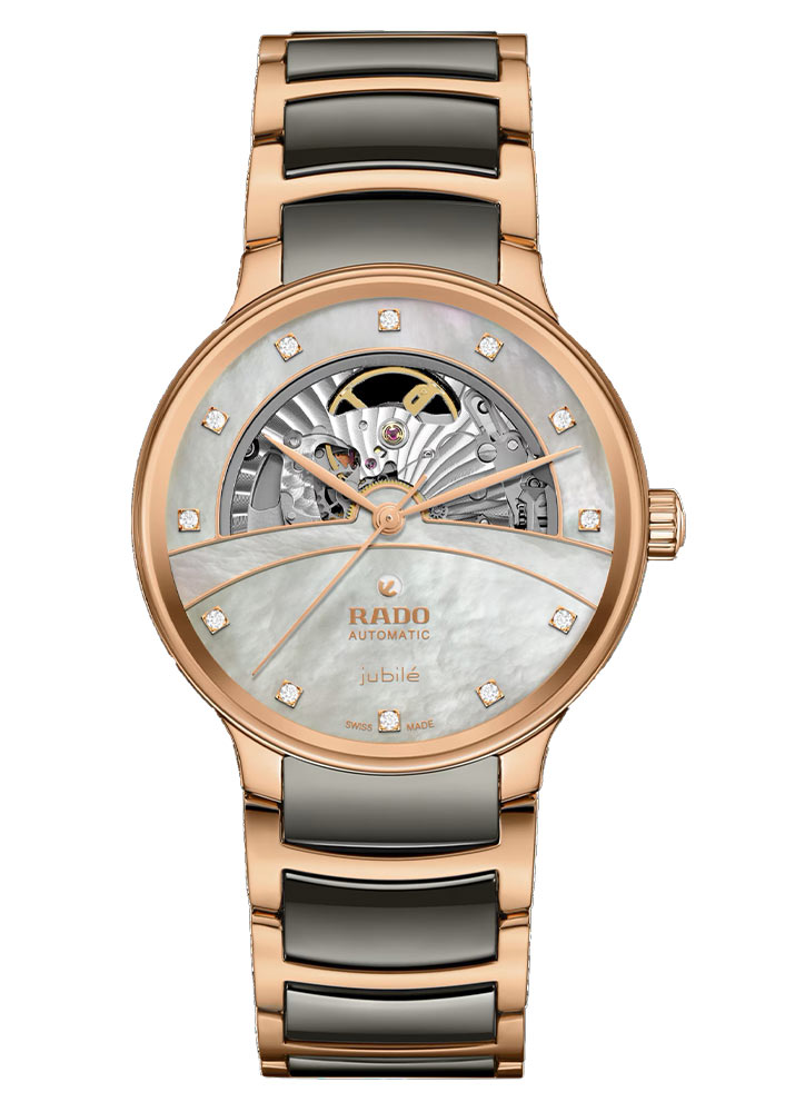 Úchvatný ciferník z lehké perleti překrytý kvalitním safírovým sklem podtrhuje nejen funkčnost, ale i estetiku hodinek. Na něm 12 skutečných diamantů, rozložených do celých hodinových bodů, mu dodává jedinečný lesk. Aktuální čas ukazují velké a čitelné růžovo-zlaté ručičky. Hodinky jsou vybaveny švýcarským automatickým strojkem Rado R734, který poskytuje působivou rezervu chodu až 80 hodin, a antimagnetickou vlásenkou Nivachron™ zaručující přesnost a spolehlivost.
