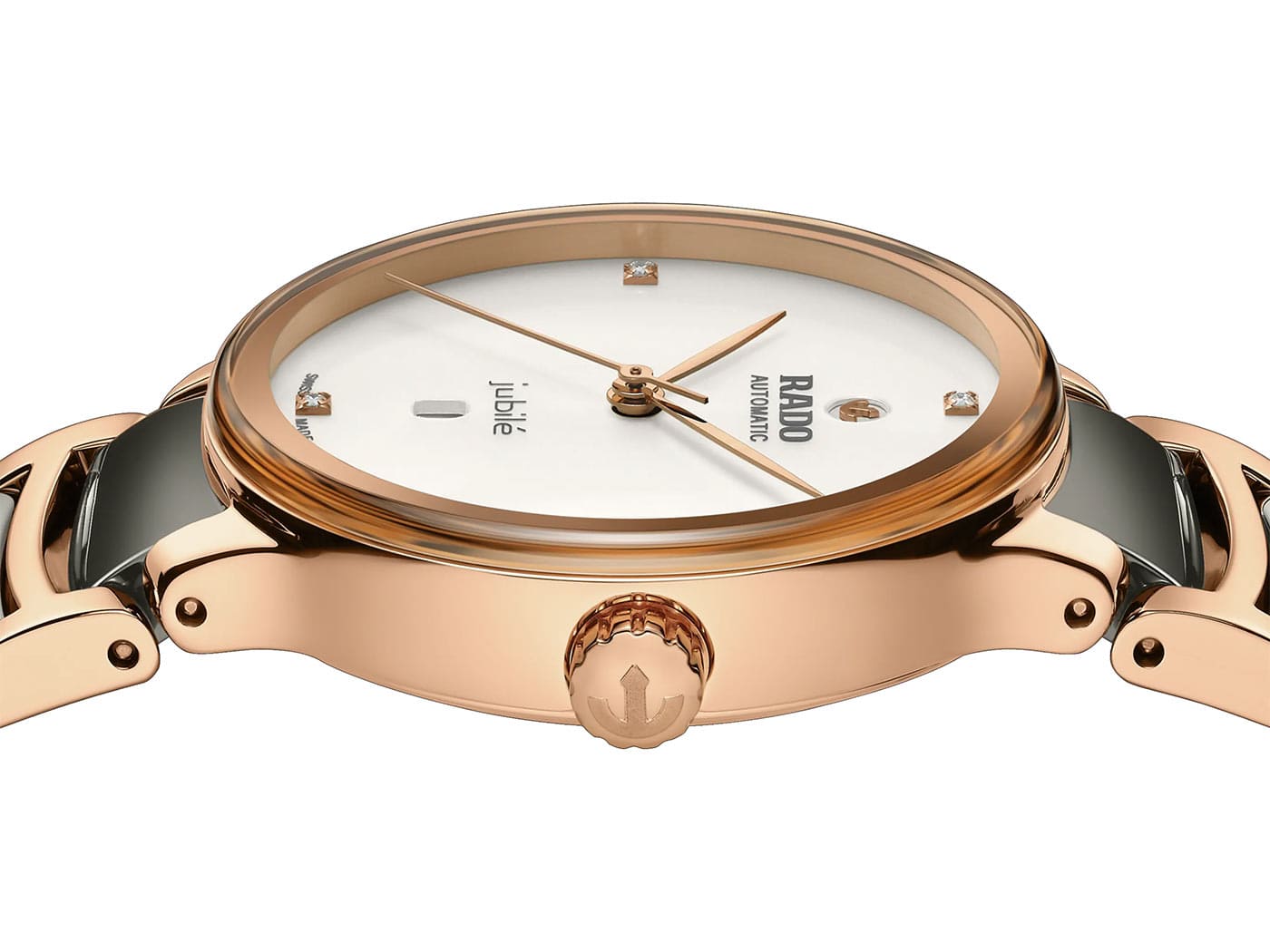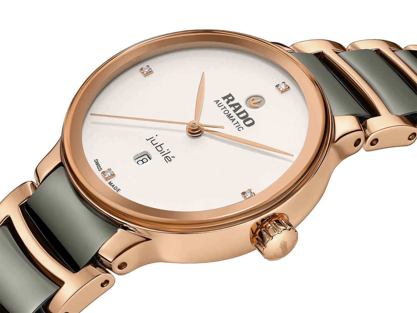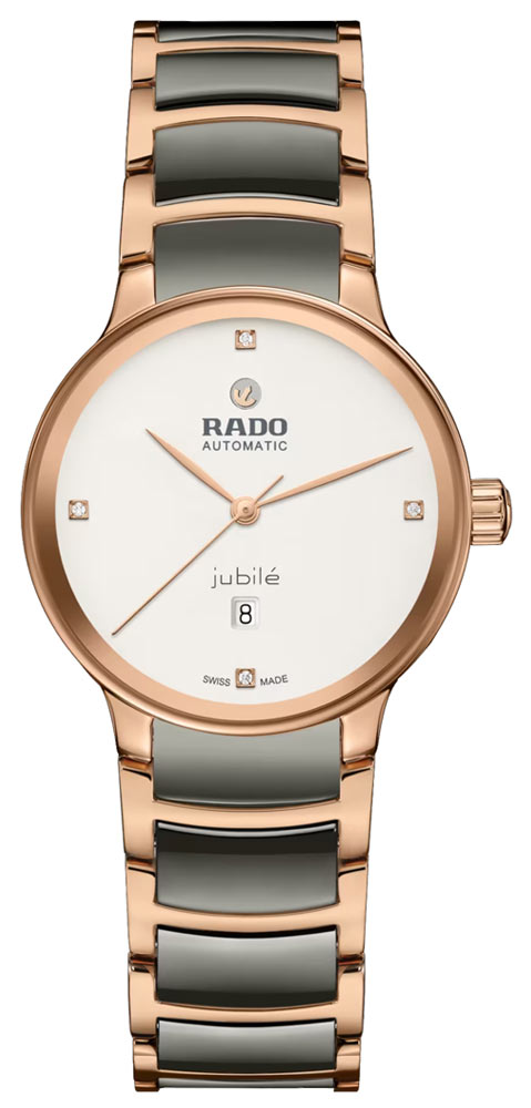 Stříbrně lakovaný ciferník se 4 diamanty, zvýrazněný natištěným logem "jubilé" dokonale ladí s ručkami z růžového zlata. Uvnitř šedých hodinek Rado Centrix Automatic Diamonds je tříručičkový Machineek R582 s rezervou chodu 48 hodin. Překračuje standardní požadavky na test přesnosti 3 až 5 poloh díky antimagnetické vlasové pružině Nivachron™, která zvyšuje spolehlivost a přesnost.
