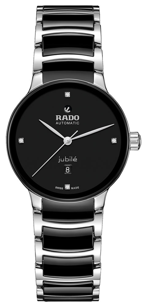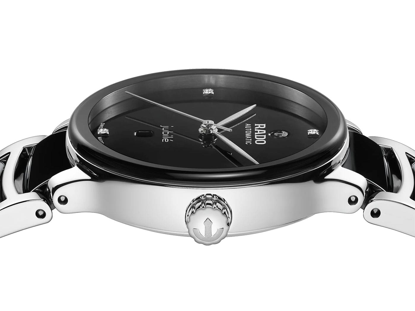 Černě lakovaný ciferník se 4 diamanty, zvýrazněný natištěným logem "jubilé" dokonale ladí s rhodiovanými ručičkami. Uvnitř černých hodinek Rado Centrix Automatic Diamonds je tříručičkový Machineek R582 s rezervou chodu 48 hodin. Překračuje standardní požadavky na test přesnosti 3 až 5 poloh díky antimagnetické vlasové pružině Nivachron™, která zvyšuje spolehlivost a přesnost.