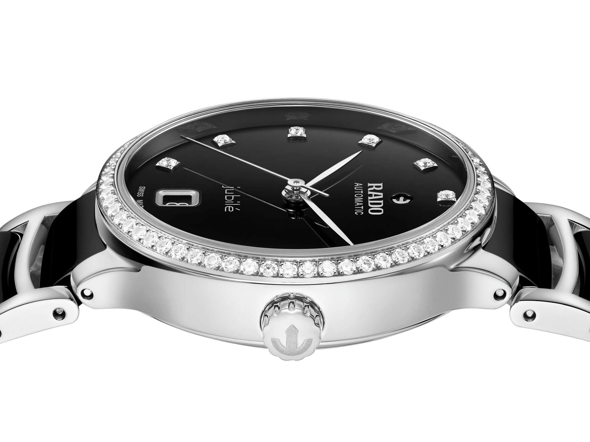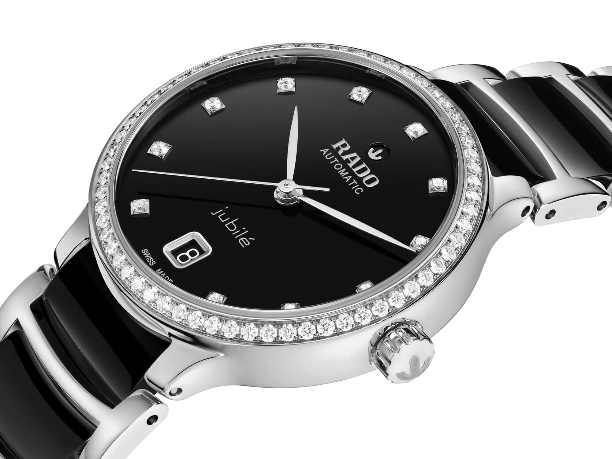 Hodinky Rado Centrix Super Jubile byly vyrobeny z nejmodernějších materiálů, které spojují estetiku s funkčností. Pouzdro o průměru 35 mm, vyrobené z vysoce kvalitní nerezové oceli, zajišťuje odolnost vůči poškození a zároveň lehkost a pohodlí při nošení. Významnou součástí tohoto modelu je náramek, který kombinuje ocelové články s elegantními černými keramickými články z high-tech keramiky. Tento materiál okouzluje svou hlubokou barvou a dokonale hladkým povrchem, navíc je hypoalergenní, což znamená, že hodinky jsou vhodné i pro citlivou pokožku. Skrze průhledné dýnko lze obdivovat precizní práci automatického mechanismu Rado s rezervou chodu až 80 hodin, který je vybaven antimagnetickou pružinou Nivachron™. Tato inovativní součást minimalizuje vliv magnetických polí na přesnost chodu, což zaručuje spolehlivý výkon za každých podmínek.