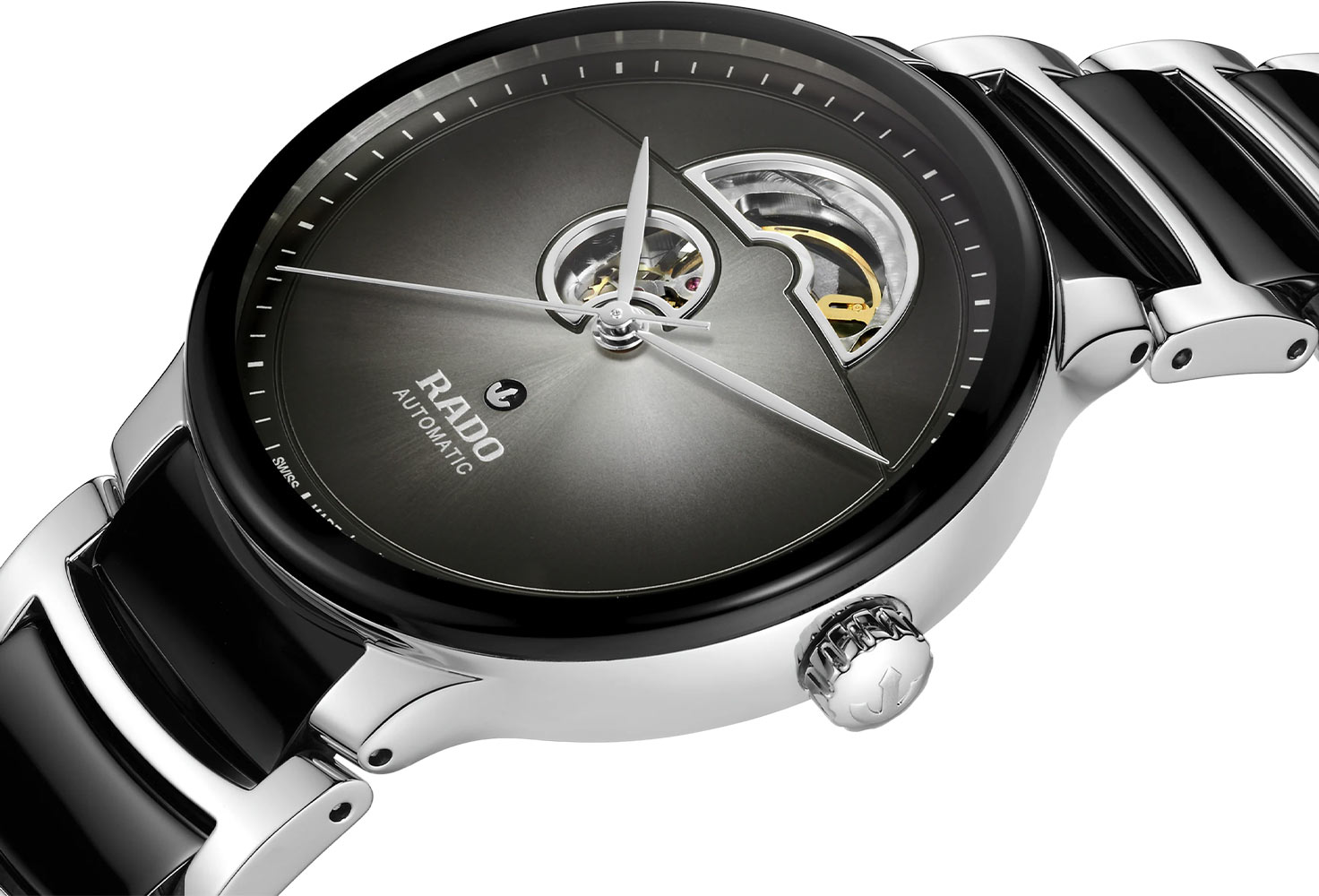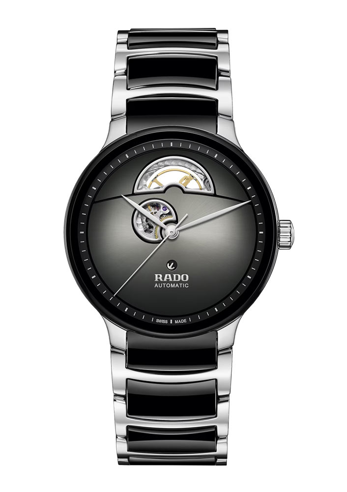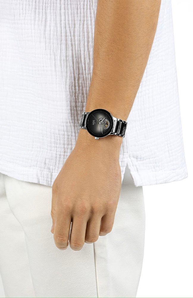 Pánské hodinky Rado Centrix Automatic Open Heart R30012152 tvoří kulaté dvoubarevné pouzdro z leštěné nerezové oceli 316L. Na stříbrném pouzdře je černý rámeček, který vytváří příjemný kontrast. Zadní strana automatických hodinek Rado má zadní pouzdro s průhledným safírovým okénkem. Umožňuje vám obdivovat práci složitého mechanismu. Hodinky o průměru 39,50 mm jsou spárovány s dvoubarevným ocelovým náramkem. Může se pochlubit černými články vyrobenými z nejkvalitnější high-tech keramiky. Náramek poskytne vysoký komfort a příjemný dotek pokožky při používání hodinek. Motýlí spona zajišťuje bezpečnost při nošení hodinek.
