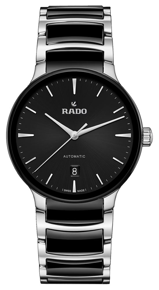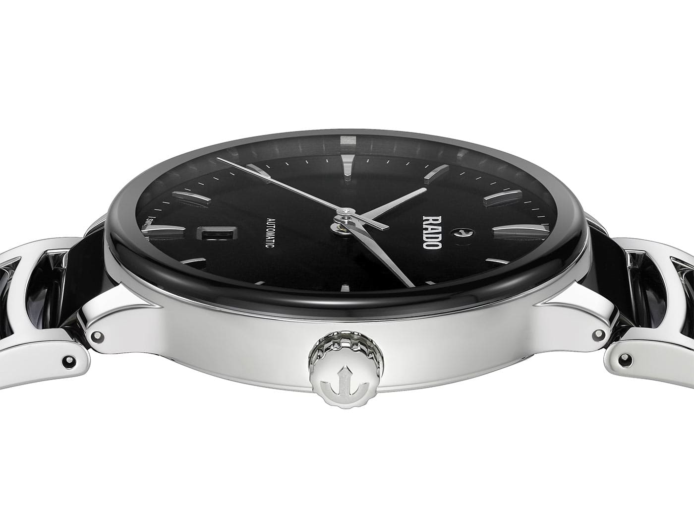 Černý sluneční ciferník obsahuje aplikované indexy v barvě rhodia, které dokonale ladí s rhodiovanými ručičkami. Uvnitř černých hodinek Rado Centrix Automatic je tříručičkový Machineek R763. Překračuje standardní požadavky na test přesnosti 3 až 5 poloh díky antimagnetické vlasové pružině Nivachron™, která zvyšuje spolehlivost a přesnost.