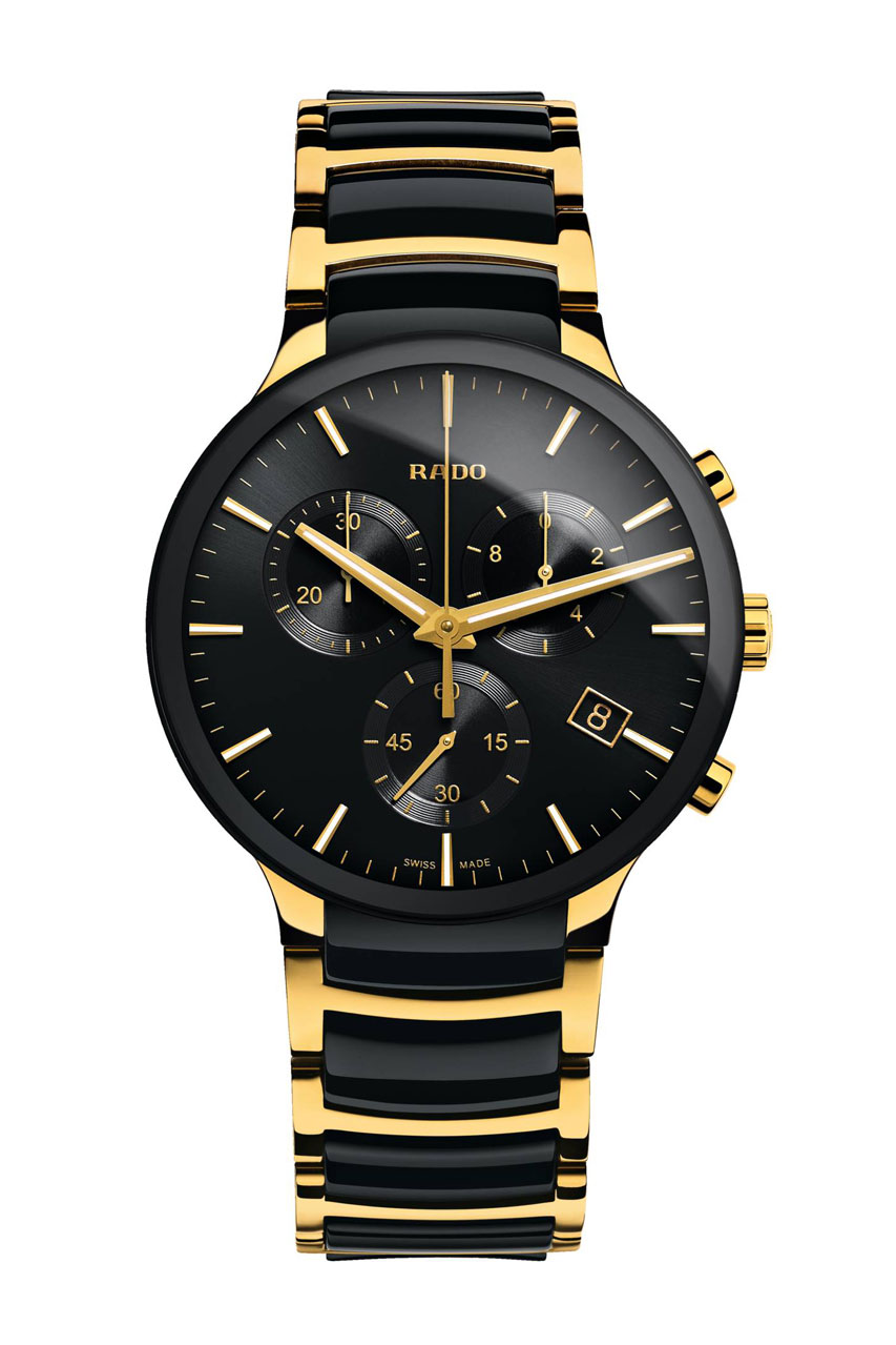 Elegantní a přitom sportovní hodinky pro muže Rado Centrix Chronograph R30134162 01.542.0134.3.016 . Kulaté pouzdro z nerezové oceli s jemnými knoflíky a korunkou na boku. Z horní strany je uzavřen safírovým sklem zdobeným černým okrajem. Uvnitř elegantního pouzdra je černý ciferník se zlatými ručičkami a počítadly chronografu. Stopky měří desetiny sekund, sekund a minut. Doplňkovou funkcí quartz Machineku je datumovka na 4. hod. Klasický design a plynulé tvary vyjadřují tím nejlepším způsobem eleganci a transparentnost s nádechem sportovního ciferníku. Černé prvky náramku jsou vyrobeny z nejkvalitnější keramiky, odolné proti poškrábání, hypoalergenní a velmi pohodlné na nošení. Bezpečnost zajišťuje titanová spona sestávající ze dvou prvků, otevírající se pomocí knoflíků.