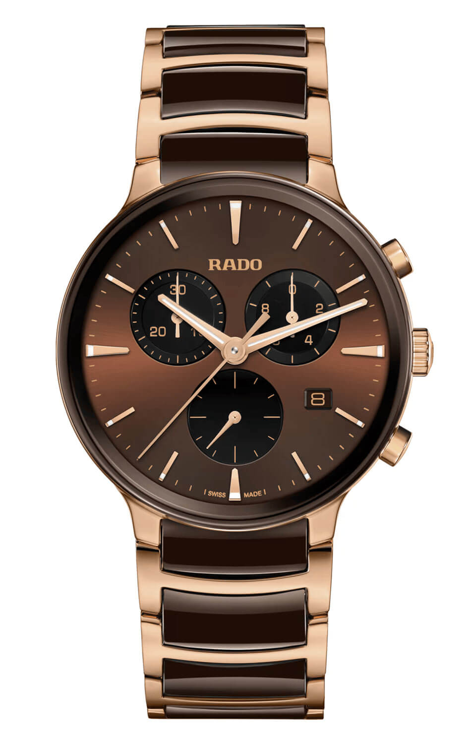 Náramek je dalším prvkem rovnováhy: kombinace zlacené oceli s lesklou hnědou high-tech keramikou ve středních článcích vytváří efekt elegance bez zbytečné okázalosti. Motýlková spona z kartáčované oceli tuto kompozici elegantně spojuje. Hodinky Rado Centrix Chronograph R30212302 na náramku jsou modelem pro ty pány, kteří se neptají na trendy – oni je určují.