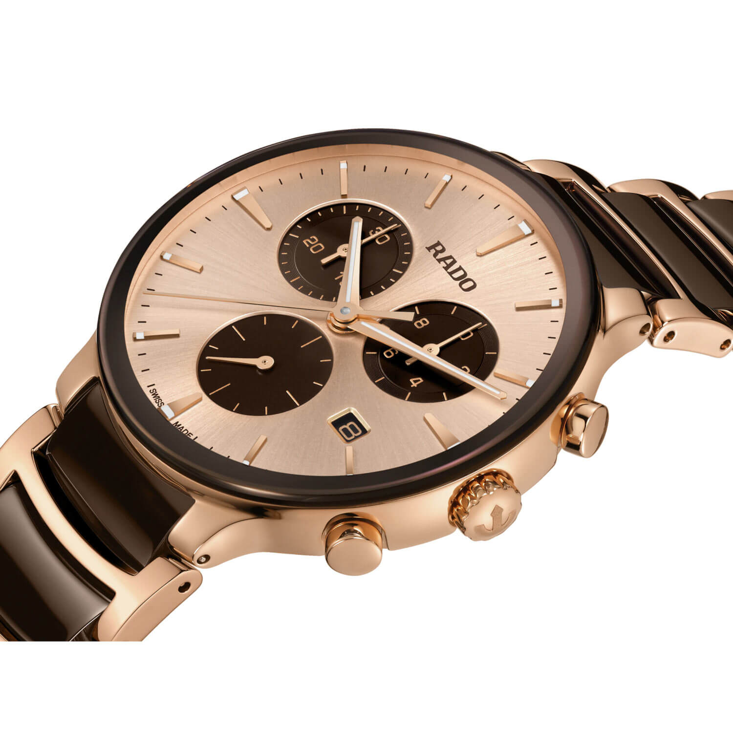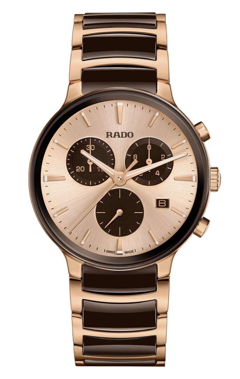 Náramek je dalším prvkem rovnováhy: kombinace zlacené oceli s lesklou hnědou high-tech keramikou ve středních článcích vytváří efekt elegance bez zbytečné okázalosti. Motýlková spona z kartáčované oceli tuto kompozici elegantně spojuje. Hodinky Rado Centrix Chronograph R30212402 na náramku jsou modelem pro ty pány, kteří se neptají na trendy – oni je určují.