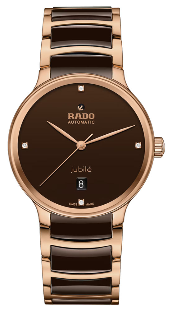 Elegantní hodinky Rado Centrix Diamonds R30017712 se 4 efektně třpytivými diamanty osazenými na hnědém ciferníku s datumovkou a podpisem výrobce. Díky použití vysoce odolného proti poškrábání a průhledného safírového skla je zobrazení diamantového času vždy dokonalé a hodinky samotné vypadají vždy jako nové.