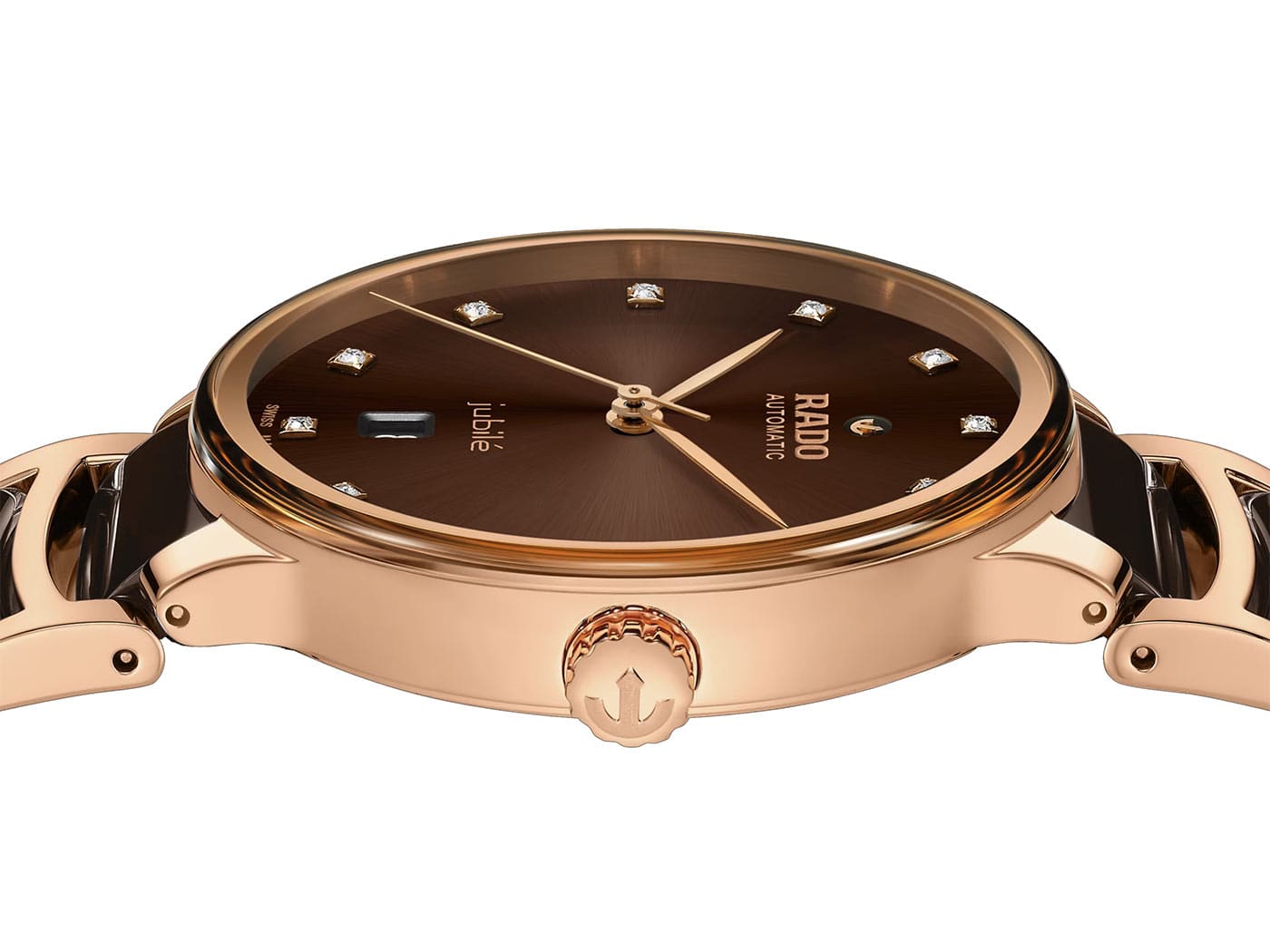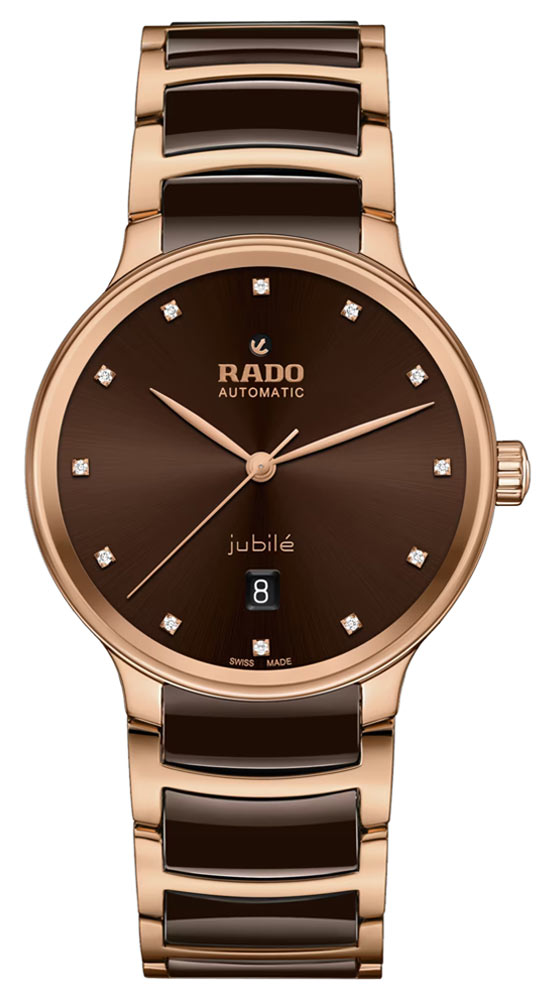 Elegantní hodinky Rado Centrix Diamonds R30017732 s 12 efektně třpytivými diamanty osazenými na hnědém ciferníku s datumem a podpisem výrobce. Díky použití vysoce odolného proti poškrábání a průhledného safírového skla je zobrazení diamantového času vždy dokonalé a hodinky samotné vypadají vždy jako nové.