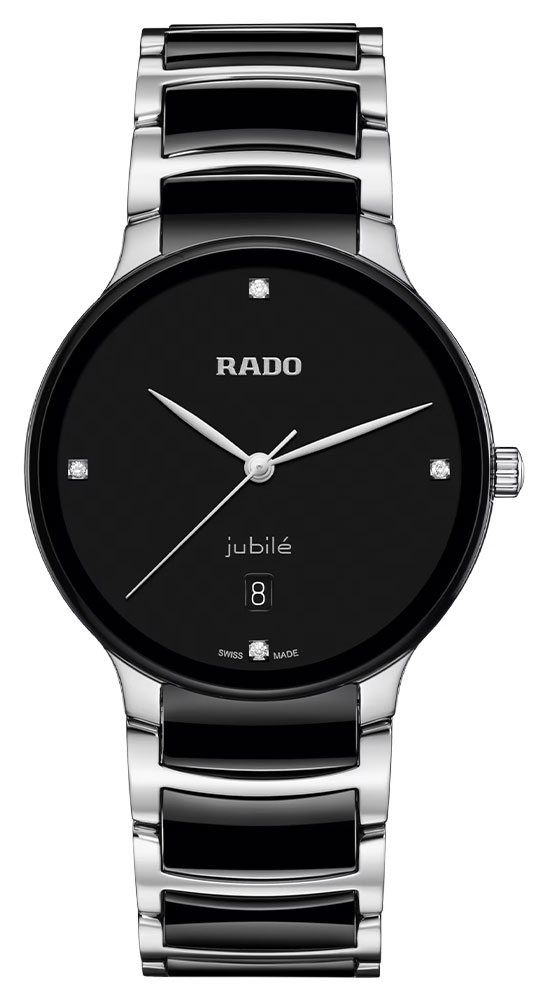 Elegantní hodinky Rado Centrix Diamonds R30021712 se 4 efektně třpytivými diamanty osazenými na černém ciferníku s datumem a podpisem výrobce. Díky použití vysoce odolného proti poškrábání a průhledného safírového skla je zobrazení diamantového času vždy dokonalé a hodinky samotné vypadají vždy jako nové.