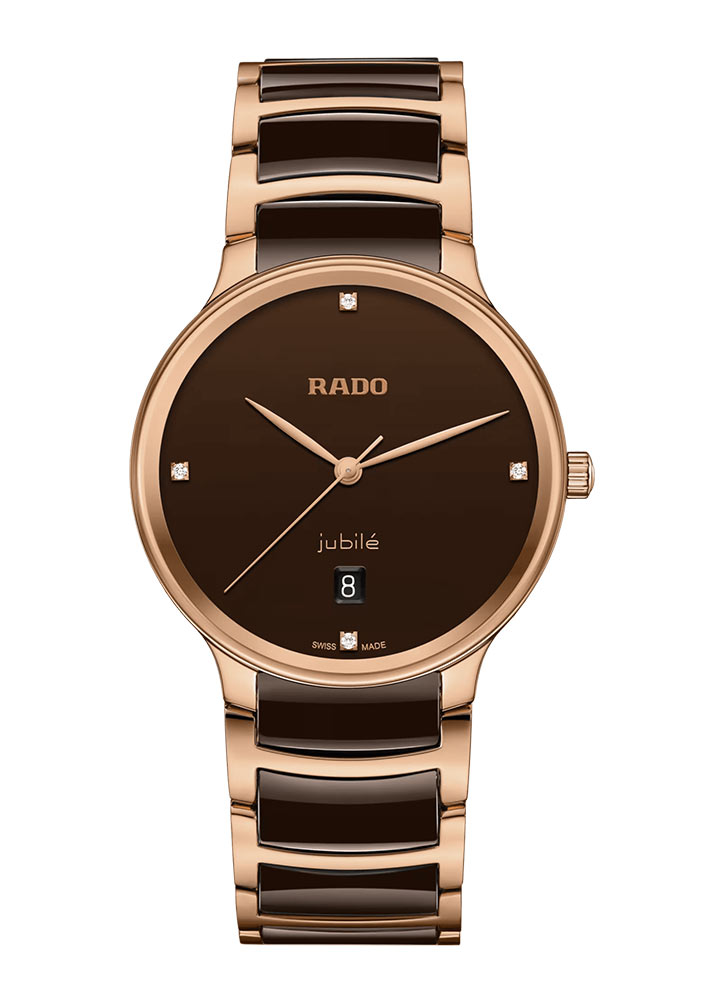 Celá přední plocha pouzdra pánských hodinek Rado je pokryta kvalitním safírovým sklem. Minimalistický a přesto elegantní hnědý ciferník chrání okénko vysoce odolné proti poškrábání. Ciferník je skutečný luxus, protože jsou na něm zasazeny čtyři skutečné diamanty. Aktuální čas ukazují štíhlé, pozlacené ručičky. Datumové okno s tmavým pozadím na šesté hodině označuje aktuální den v měsíci. Na pozici dvanácti hodin ciferníku se objevuje hrdé logo Rado. Pozici 6 hodin těsně nad ukazatelem data zdobí nápis Jubile, který nám má připomenout šperkový charakter těchto elegantních hodinek Rado.