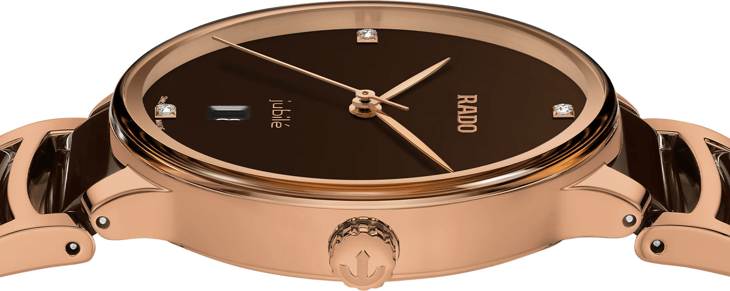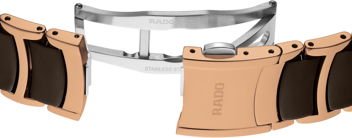 Pozlacené hodinky Rado Centrix Diamonds R30023712 jsou vyrobeny z těch nejlepších materiálů. Kulaté pouzdro z nerezové oceli je pozlaceno PVD růžovým zlatem. Zadní strana hodinek Rado je kulaté ocelové pouzdro. Hodinky Centrix o velikosti 39,50 mm jsou spárovány s unikátním náramkem. Jeho základna je z nerezové oceli pozlacená PVD povlakem z růžového zlata. Centrální články čokoládové barvy jsou high-tech keramika příjemná na dotek. Náramek zajišťuje vysoký komfort při nošení těchto módních hodinek Rado. Bezpečnost zajišťuje motýlková spona se dvěma knoflíky.
