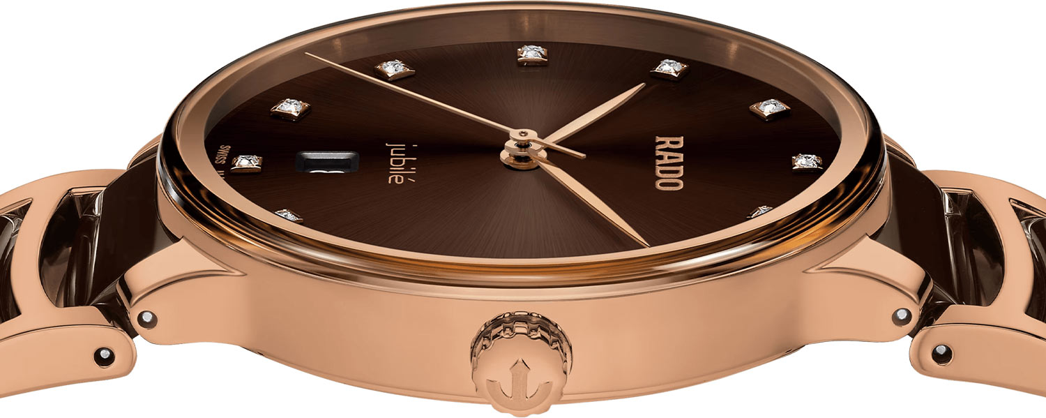 Celá přední plocha pouzdra pánských hodinek Rado je pokryta kvalitním safírovým sklem. Minimalistický a přesto elegantní hnědý ciferník chrání okénko vysoce odolné proti poškrábání. Ciferník je skutečný luxus, protože je na něm zasazeno dvanáct pravých diamantů. Aktuální čas ukazují štíhlé, pozlacené ručičky. Datumové okno s tmavým pozadím na šesté hodině označuje aktuální den v měsíci. Na pozici dvanácti hodin ciferníku se objevuje hrdé logo Rado. Pozici 6 hodin těsně nad ukazatelem data zdobí nápis Jubile, který nám má připomenout šperkový charakter těchto elegantních hodinek Rado.