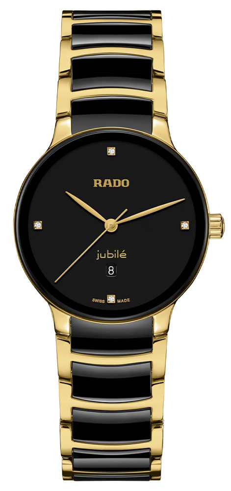 Elegantní dámské hodinky Rado Centrix Diamonds R30025712 se 4 efektně třpytivými diamanty osazenými na černém ciferníku s datumem a podpisem výrobce. Díky použití vysoce odolného proti poškrábání a průhledného safírového skla je zobrazení diamantového času vždy dokonalé a hodinky samotné vypadají vždy jako nové.
