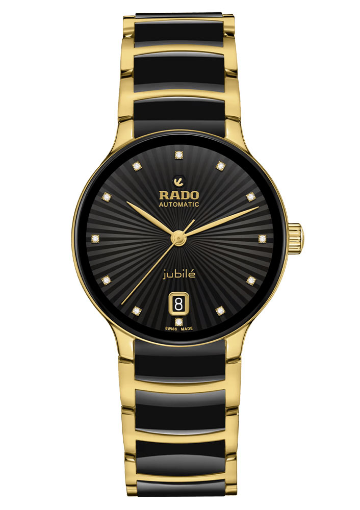 Hodinky Rado Centrix Diamonds o průměru 35 mm vypadají na unikátním náramku skvěle. Skládá se ze základní nerezové oceli s pozlaceným PVD povlakem a centrálními černými keramickými články. High-tech keramika zaručuje nejen jedinečný vzhled, ale také pohodlí při nošení. Motýlí spona se dvěma knoflíky zajišťuje bezpečnost a pohodlí při používání. Zadní strana hodinek Rado má průhledné okénko, které vám umožňuje obdivovat přesnost mechanismu Rado.