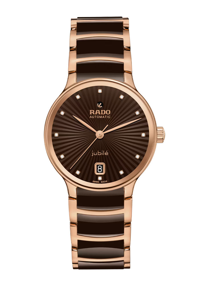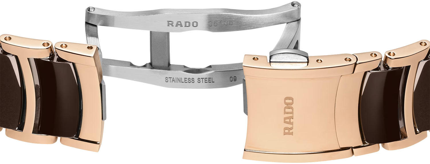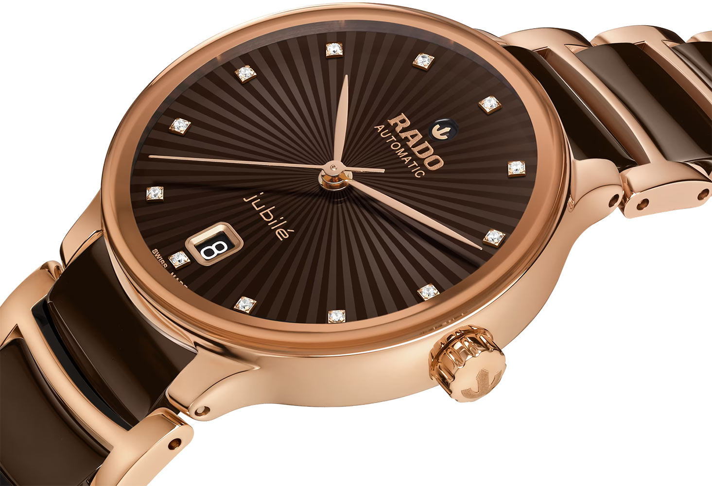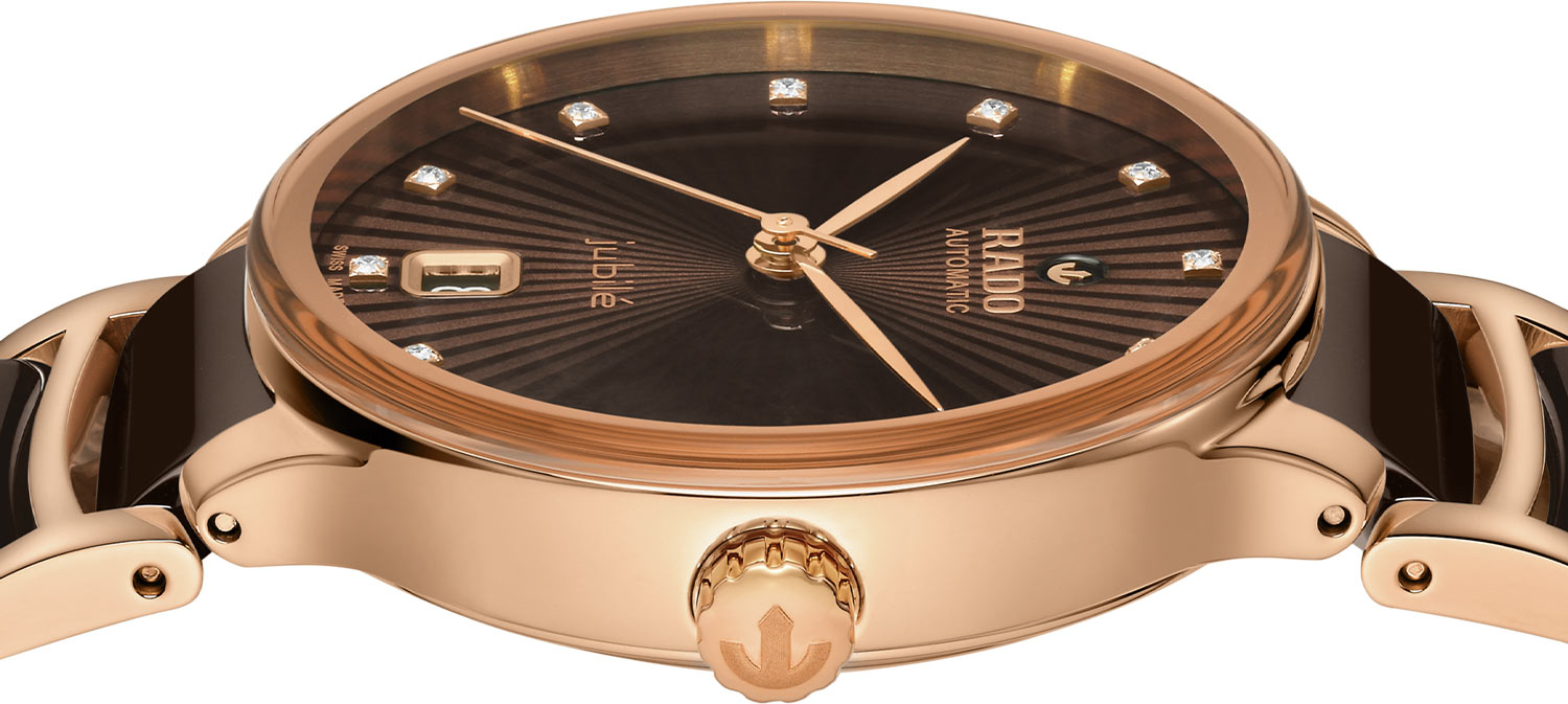 Pozlacené hodinky Rado Centrix Diamonds Automatic R30037732 jsou vyrobeny z těch nejlepších materiálů. Kulaté pouzdro z nerezové oceli je pozlaceno PVD růžovým zlatem. Zadní strana hodinek Rado je kulatý kryt s průhledným okénkem, který umožňuje obdivovat práci mechanismu Rado. 35mm hodinky Centrix Diamonds jsou spárovány s jedinečným náramkem. Jeho základna je z nerezové oceli pozlacená PVD povlakem z růžového zlata. Centrální, hnědé články jsou high-tech keramika, která je příjemná na dotek. Náramek zajišťuje vysoký komfort při nošení těchto módních hodinek Rado. Bezpečnost zajišťuje motýlková spona se dvěma knoflíky.