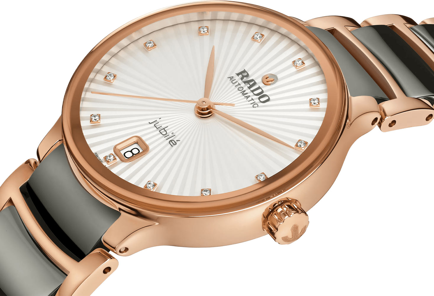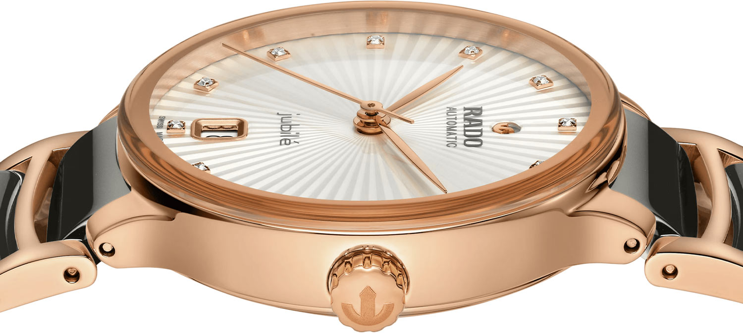 Celá přední plocha pouzdra dámských hodinek Rado je pokryta kvalitním safírovým sklem. Okénko vysoce odolné proti poškrábání chrání minimalistický, elegantní ciferník s dvanácti skutečnými diamanty po celých hodinách. Aktuální čas ukazují štíhlé, pozlacené ručičky. Datumové okénko se světlým pozadím na 6. hodině označuje aktuální den v měsíci. Na pozici dvanácti hodin gilošového číselníku, těsně pod lesklým diamantem, se objevuje hrdé logo Rado doprovázené kotvou, která je neodmyslitelným symbolem značky. Nad datumovkou se objevuje nápis Jubile, který nám má připomenout šperkový charakter těchto elegantních hodinek Rado.