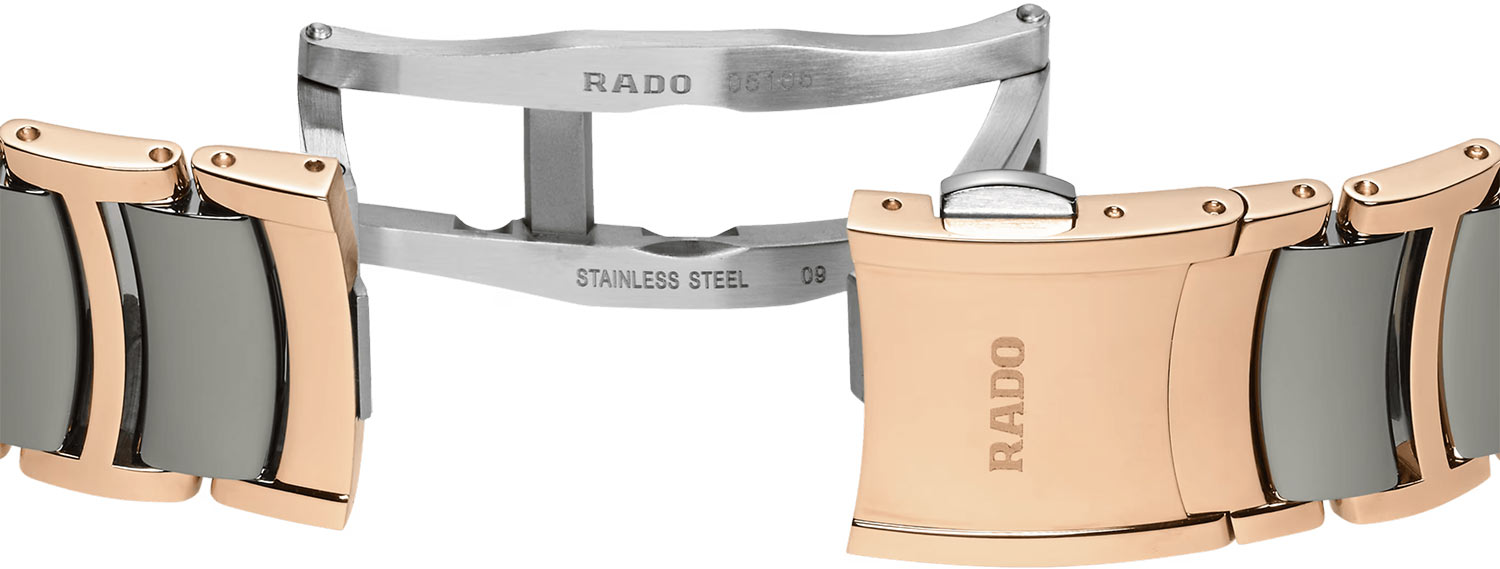 Pozlacené hodinky Rado Centrix Diamonds Automatic R30037742 jsou vyrobeny z těch nejlepších materiálů. Kulaté pouzdro z nerezové oceli je pozlaceno PVD růžovým zlatem. Zadní strana hodinek Rado je kulatý kryt s průhledným okénkem, který umožňuje obdivovat práci mechanismu Rado. 35mm hodinky Centrix Diamonds jsou spárovány s jedinečným náramkem. Jeho základna je z nerezové oceli pozlacená růžovo-zlatým PVD povlakem. Plazmově zbarvené centrální články jsou high-tech keramika příjemná na dotek. Náramek zajišťuje vysoký komfort při nošení těchto módních hodinek Rado. Bezpečnost zajišťuje motýlková spona se dvěma knoflíky.