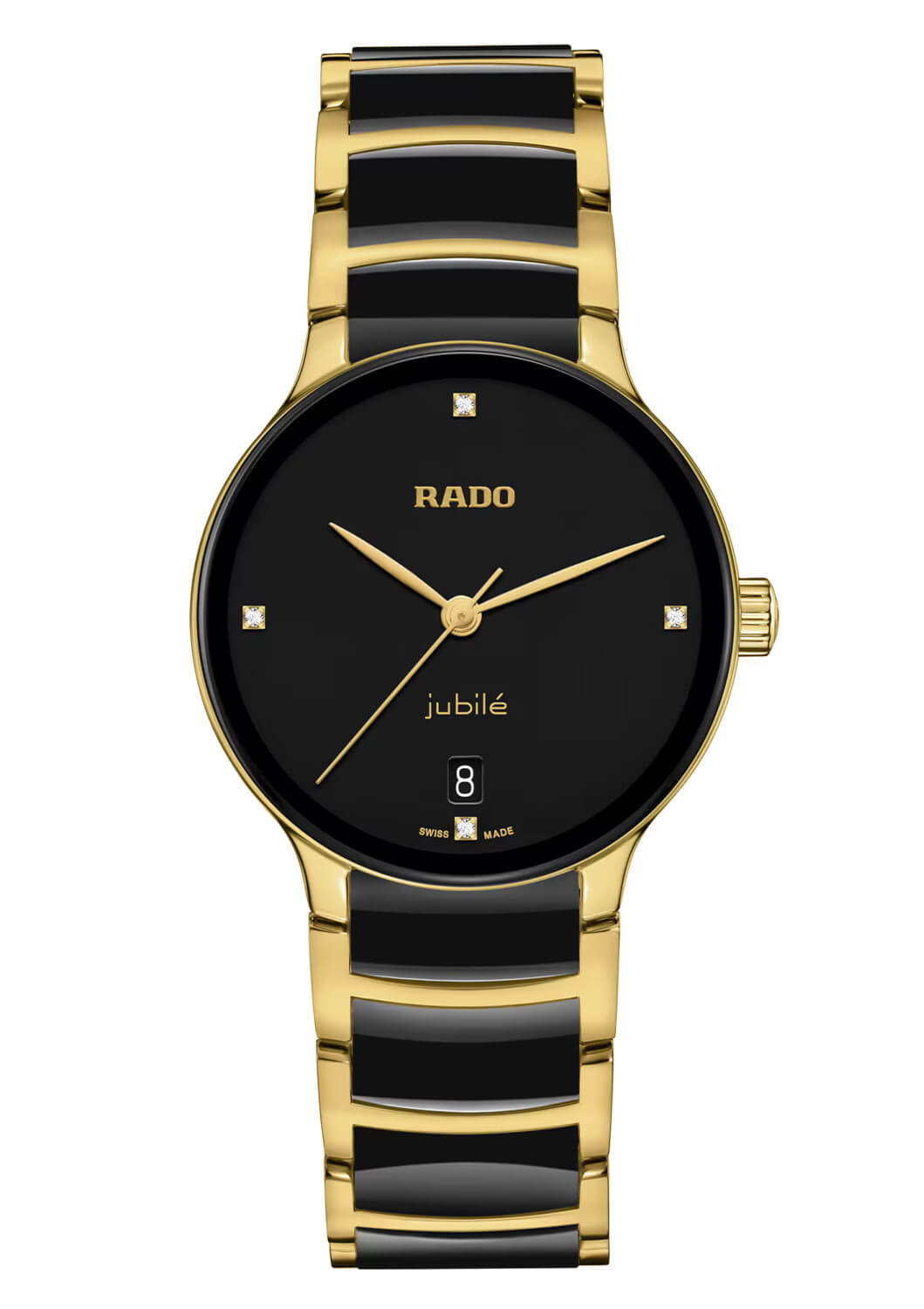 Dámské hodinky Rado Centrix Diamonds o průměru 35 mm vypadají skvěle s pozlaceným pouzdrem zavěšeným na unikátním náramku. Skládá se ze základní nerezové oceli ve zlatém PVD a centrálních černých keramických článků. High-tech keramika zaručuje nejen jedinečný vzhled, ale také pohodlí při nošení. Motýlí spona se dvěma knoflíky zajišťuje bezpečnost a pohodlí při používání. Zadní strana hodinek Rado je ocelový kryt, který obepíná celou konstrukci.