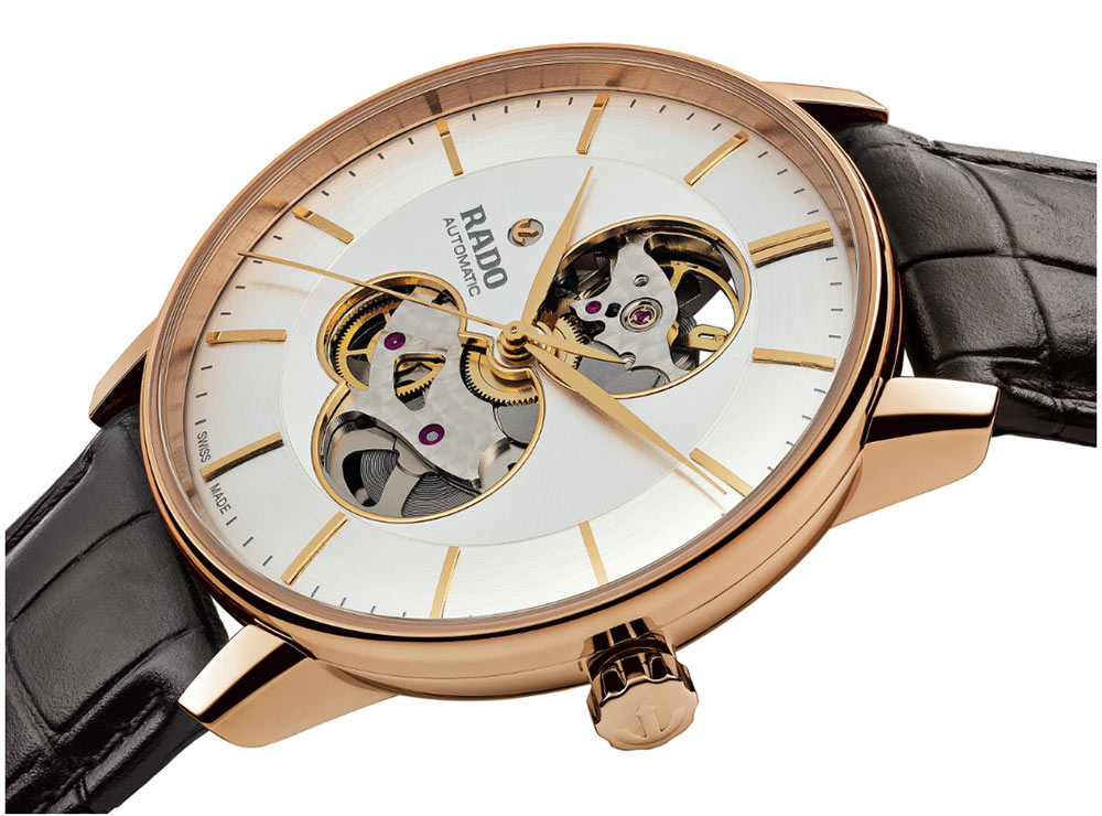 Exkluzivní pánské hodinky Rado Coupole Classic Automatic R22894163 . První hodinky v kolekci Coupole vznikly v roce 1987 a okamžitě oslovily muže, kteří hledali minimalistické, klasické hodinky. Dnešní model v sobě nese tohoto ducha minulosti, ale byl také obohacen o úžasné detaily. Coupole je okamžitě rozpoznatelný díky tenkým rukojetím, které spojují pouzdro a kožený pásek. Vzhled tradičních hodinek dodává Radův podpisový prvek, dokonale sladěné safírové sklo pouzdru, poskytující oslnivý lesk, snadnou čitelnost a vynikající ochranu krásného stříbrného ciferníku. Výrazný ciferník Open Heart předvádí hypnotické působení rovnováhy, navíjecí pružiny a přesných pohybových komponent. Nejen na přední, ale i na spodní straně hodinek můžete obdivovat krásné ozdoby Machineku, a to díky proskleným zádům se safírovým sklíčkem. Uvnitř je kvalitní automat ETA C07.631 s prodlouženou rezervou chodu 80 hodin. Hodinky si můžete sundat v pátek v 17:00 a v pondělí v 7:00 budou stále fungovat. Není třeba znovu nastavovat čas. Hodinky Rado Coupole Classic Automatic jsou perfektním doplňkem vašeho společenského oděvu, ale také skvěle doplní váš každodenní šatník. Praktické a extrémně elegantní. Model je propracován do nejmenších detailů.