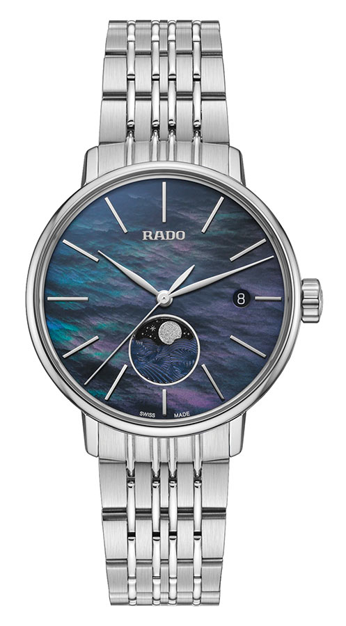 Dámské hodinky Rado Coupole Classic Moon Phase R22883913 jsou okouzlujícím doplňkem pro ženy, které ocení jedinečné věci. Prezentované hodinky s obálkou o průměru 34 milimetrů z odolné nerezové oceli zaujmou svými mimořádnými vlastnostmi na každém kroku. Počínaje ciferníkem krytým safírovým sklem odolným proti poškrábání, procházejícím ocelovým pouzdrem a konče uspořádaným a precizním vnitřkem, existují o tom nezvratné důkazy. Třpytivé tajemné odstíny, tmavá perleť na číselníku s ozdobným indikátorem fáze měsíce a aplikované lineární indexy dokonale ozdobí každý formální outfit. Díky elegantnímu pouzdru a víceřadému náramku se dvěma typy povrchových úprav lze tento luxusní model kromě speciálních příležitostí nosit i každý den.