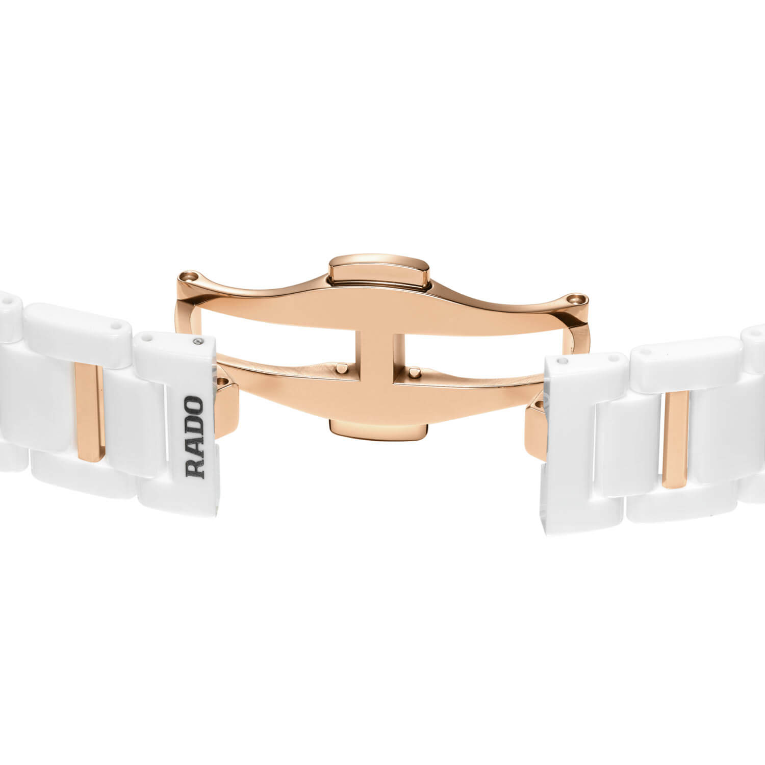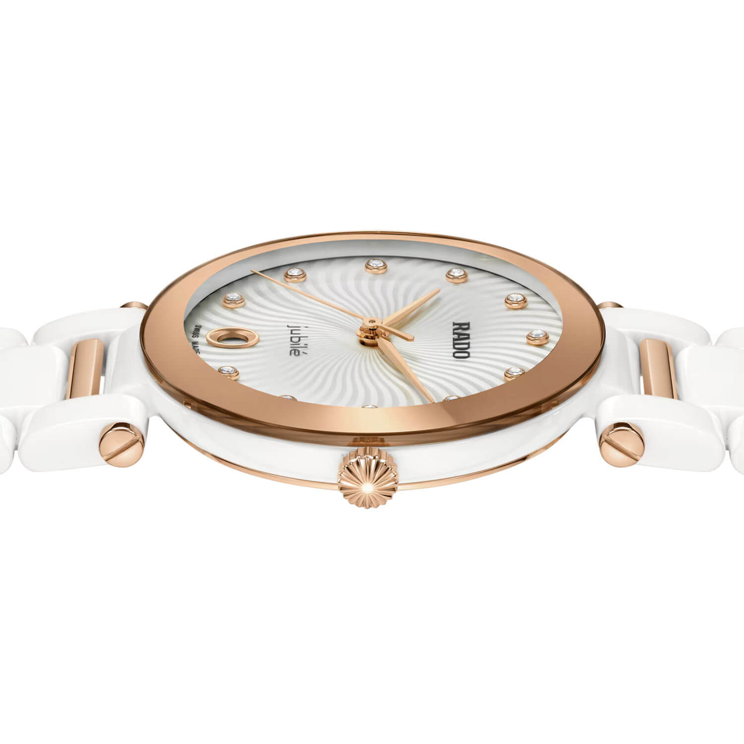 Pouzdro o průměru 31 mm je vyrobeno z bílé high-tech keramiky typu monoblok, která zajišťuje odolnost proti poškrábání a zároveň lehkost a příjemný kontakt s pokožkou. Vypouklé safírové sklíčko s kovovým lemem podtrhuje elegantní charakter hodinek, zatímco vodotěsnost do 50 metrů umožňuje pohodlné nošení v každodenních podmínkách. Náramek z leštěné keramiky je doplněn o články z nerezové oceli ve zlaté úpravě PVD, což vytváří vyváženou vizuální a funkční kompozici. Celek uzavírá pohodlná ocelová spona, která nenarušuje plynulou linii náramku.