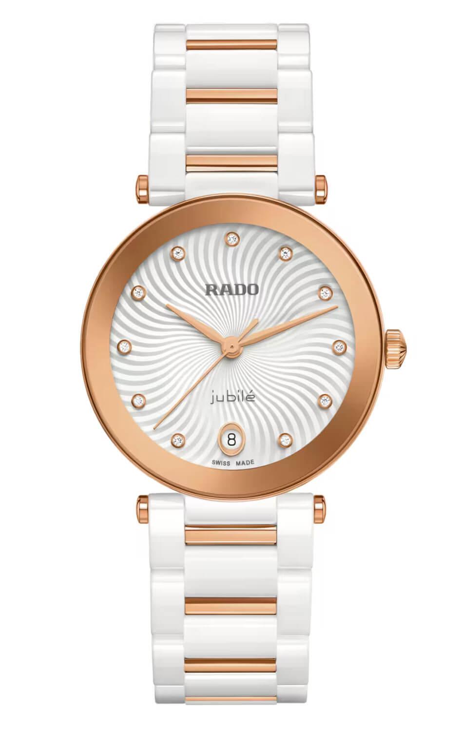 Sněhově bílý ciferník zaujme dekorativním vlnovým vzorem, který mu dodává hloubku a sofistikovanost, zatímco jeho povrch rozzáří diamantové indexy (11 kusů) ve výbrusu Top Wesselton. Minimalistické datumové okénko na pozici šesté hodiny neruší harmonii rozvržení a zapadá do elegantního, ale praktického charakteru modelu. Hodinky Rado na náramku jsou vybaveny švýcarským strojkem R218 s technologií PreciDrive™, která zajišťuje nejen spolehlivost, ale i vysokou přesnost. Ceramické hodinky s diamanty Rado R22240703 jsou esencí luxusu – hodinky navržené jako umělecké dílo, které se nosí každý den.