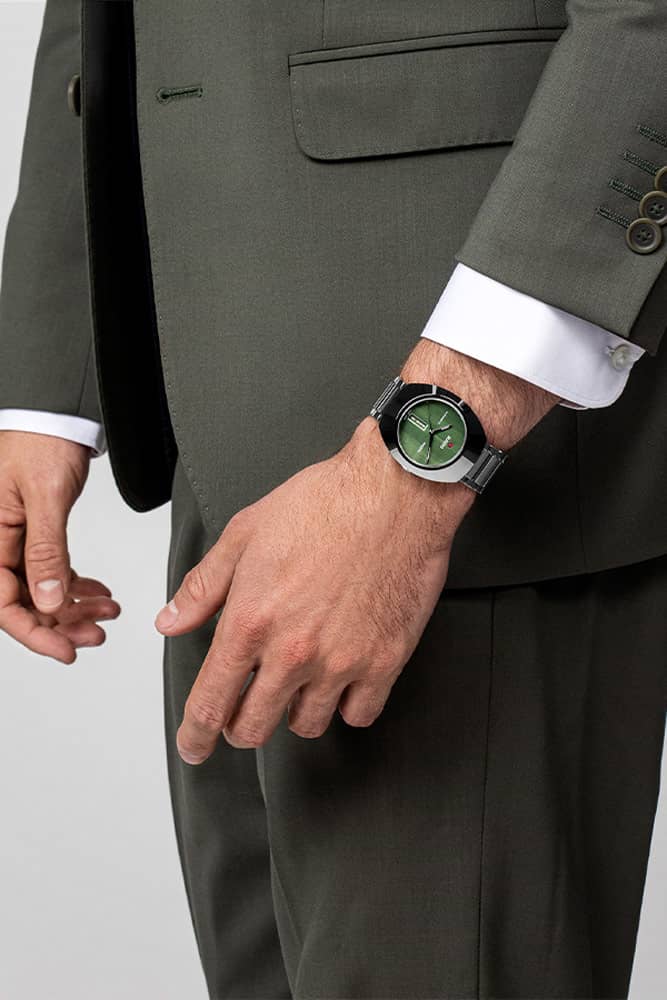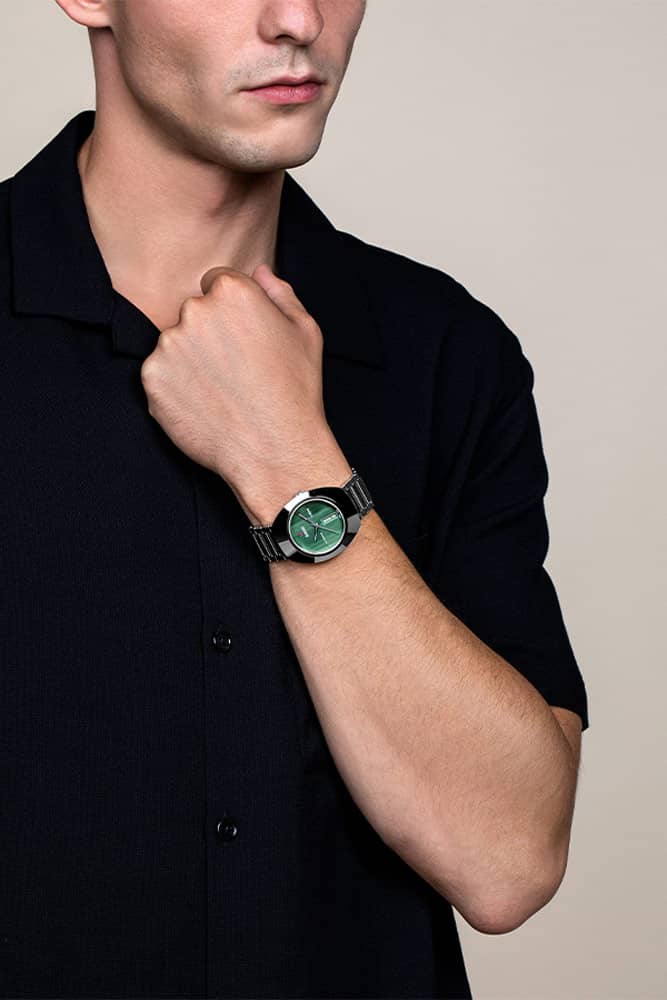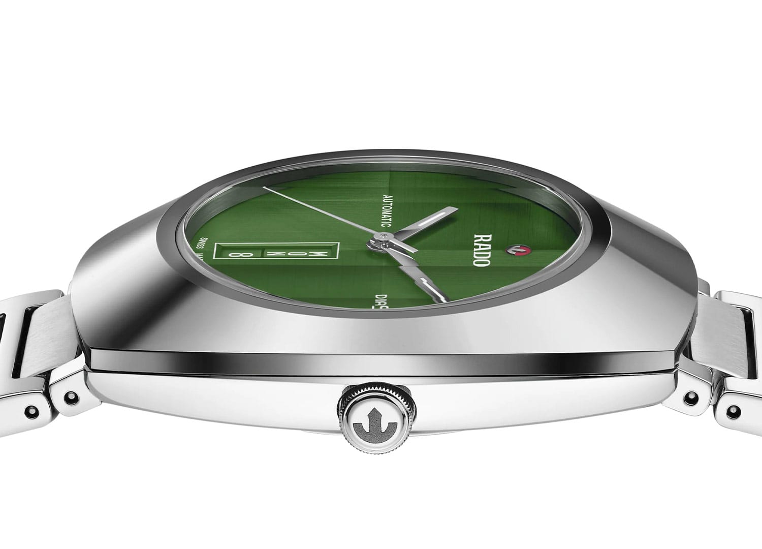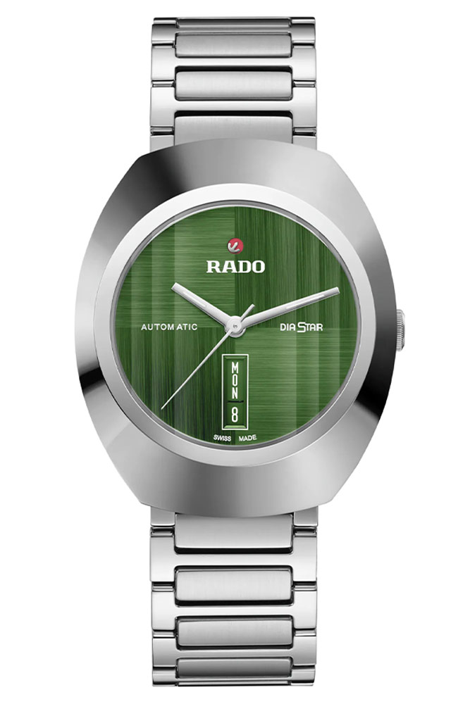 Před pěti desítkami let způsobil Rado revoluci v hodinářství se svými ikonickými hodinkami odolnými proti poškrábání. Dnes Rado Original kombinuje odvážný a nadčasový design svého předka jako skutečnou klasiku, která nese nezaměnitelný podpis svého impozantního, tvrdého povrchu pouzdra. Jeho design je veskrze moderní a má výrazný sportovní nádech. Rado DiaStar Original Automatic R12160303 je oválný kryt vyrobený z patentovaného materiálu Rado Ceramos™. Pouzdro je orámováno ultra lesklým svrškem Ceramos™ s leštěnými úhly a detaily, umístěnými na ladícím monochromatickém pouzdru z nerezové oceli. Safírové sklíčko extrémně tvrdé a těžko poškrábatelné chrání zelený ciferník. Sklo u modelu R12160303 je fasetováno v podobě rovnoběžných pruhů. Ciferník má velké, čitelné ručičky a rozšířené datumové okénko na pozici šesté hodiny. Datumovka označuje zkrácený název dne v týdnu a dne v měsíci. Elegantní náramek skládající se z plných článků je připevněn k okům pouzdra. Náramek má bezpečné motýlkové zapínání.