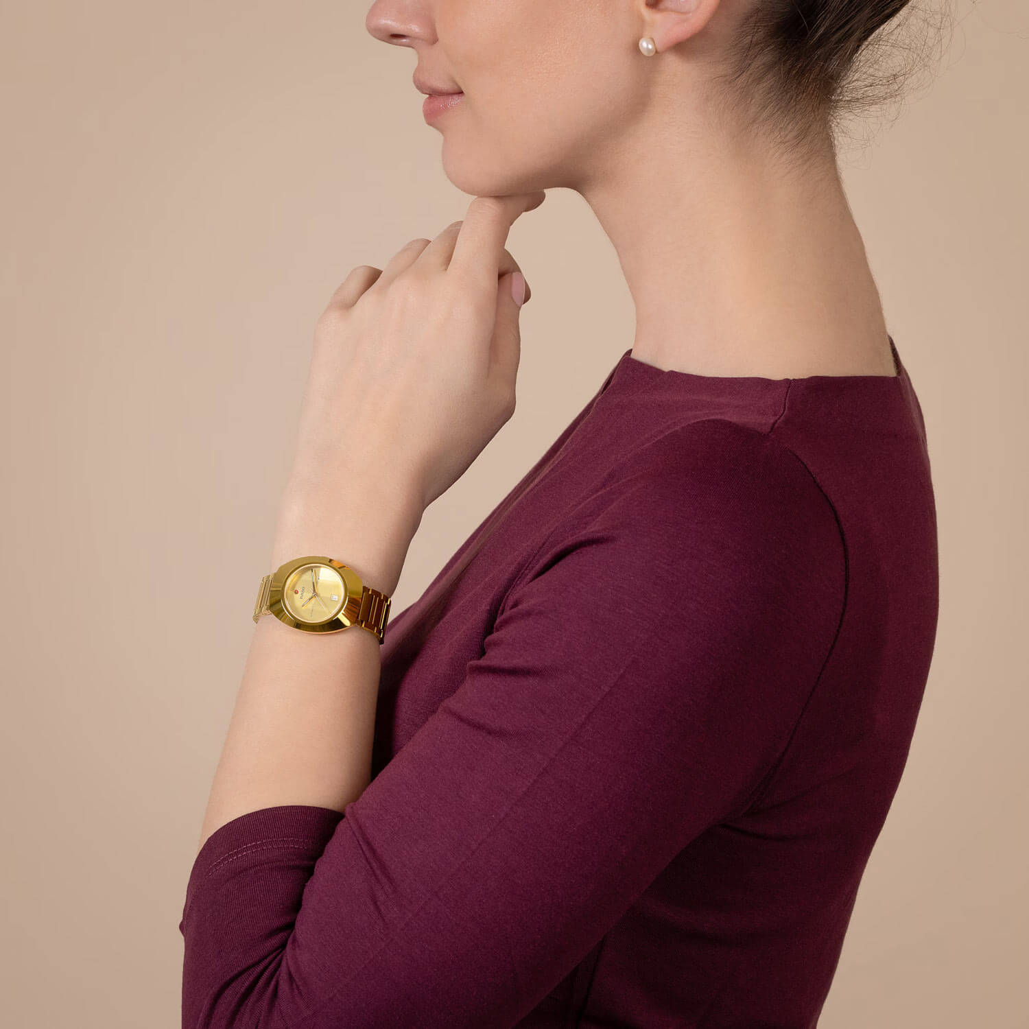 Žlutozlatý ciferník se svislým kartáčováním nepotřebuje ozdoby – jeho textura a teplý odstín si pohrávají s odlesky světla a zdůrazňují minimalistickou eleganci celé kompozice. Rodiované ručky s bílou vrstvou Super-LumiNova® zajišťují dobrou čitelnost, zatímco datumovka na šesté hodině zapadá do symetrického uspořádání číselníku. Charakteristická kotva Rado, jemně se pohybující při každém pohybu zápěstí, připomíná, co se skrývá uvnitř: švýcarský automatický strojek Rado R586 s antimagnetickou pružinou Nivachron™ a 48hodinovou rezervou chodu. Rado Automatic R12171253 jsou zlaté hodinky, které vyjadřují sílu prostřednictvím zdrženlivosti a vytříbenosti – pro ženy, které oceňují technologii oblečenou do čisté formy.