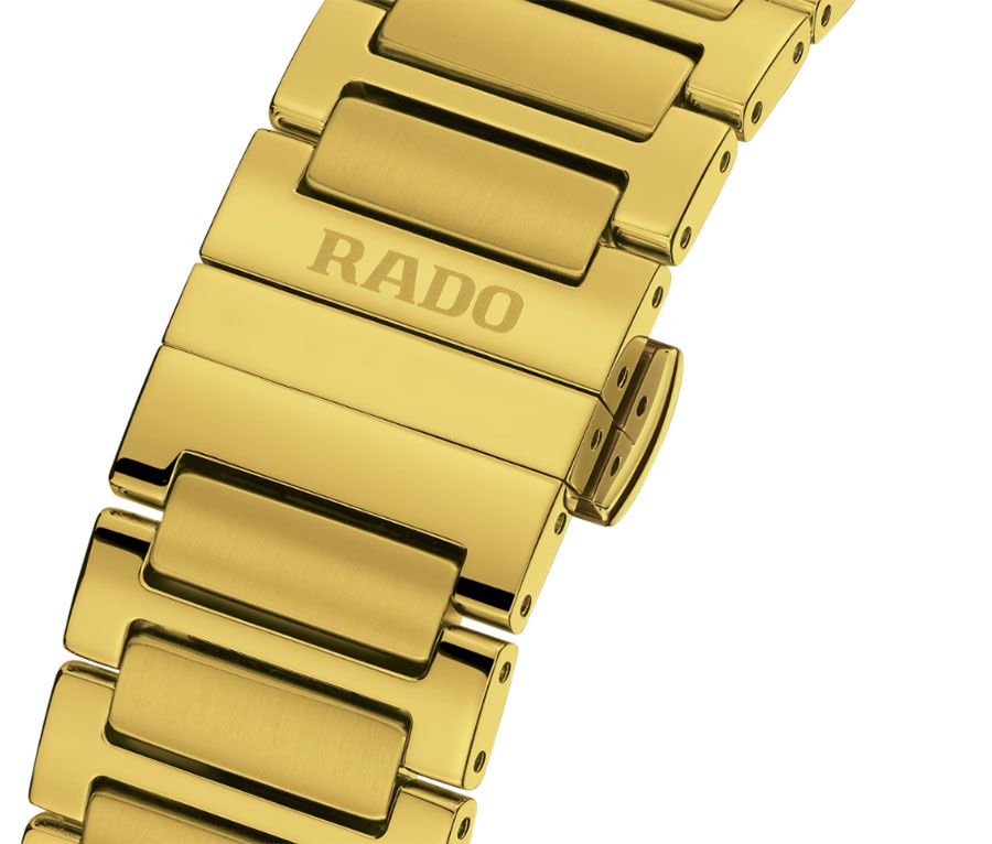 Začleněn v 38mm pouzdře z materiálu Ceramos™, tento model vypadá mimořádně, kombinujíc lesklý povrch horní části s leštěnými hranami a pozlaceným pouzdrem ze nerezové oceli. Elegantní náramek s plnými články, připojený ke spodní části pouzdra, se zavírá bezpečným motýlkovým zámkem. Keramické zlaté hodinky Rado R12164153 jsou vodotěsné do hloubky 100 metrů, umožňující volné používání při plavání.