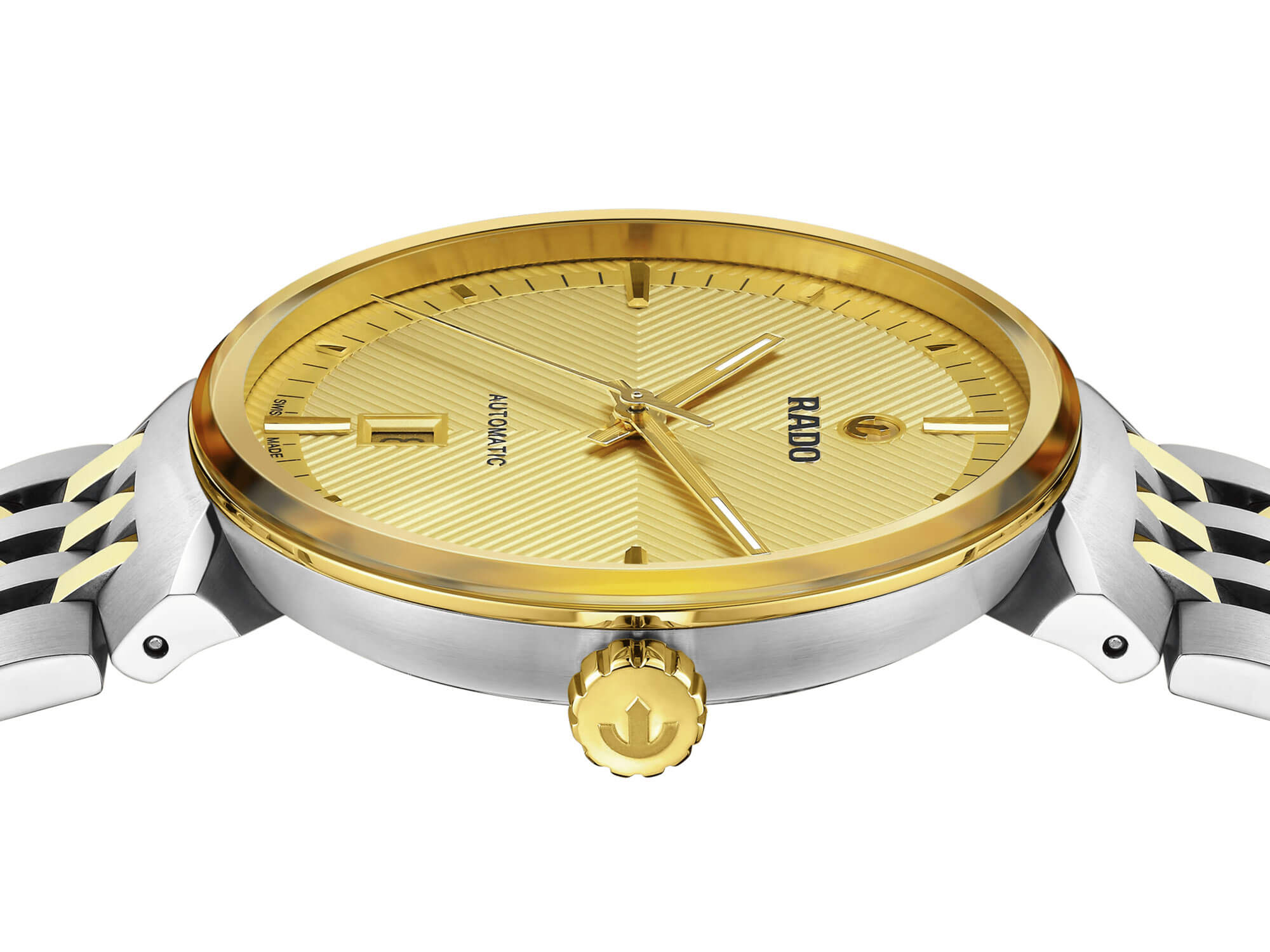 Pouzdro hodinek Rado o průměru 39 mm se vyznačuje elegantním safírovým sklem, které nejen chrání číselník, ale také plynule přechází do jeho okrajů, čímž vytváří harmonický a hladký profil. Pozlacený, metalizovaný rámeček safírového skla dokonale ladí s hlubokým zlatým odstínem číselníku, jehož reliéfní vzor přitahuje pozornost jako umělecké dílo. Detaily zde hrají hlavní roli – hodinové indexy vyrobené z rhodiovaného kovu jsou precizně leštěné a kartáčované, což číselníku dodává hypnotizující kontrast. Uprostřed číselníku se hrdě vznáší symbol kotvy Rado, který jemně odráží bohatou historii a kvalitu této prestižní značky. Stříbrno-zlatý náramek z nerezové oceli, s elegantně kartáčovanými a leštěnými články, zajišťuje pohodlné nošení a mimořádnou odolnost. Třídílné zapínání garantuje snadné a bezpečné přizpůsobení, což hodinkám přidává funkčnost, která jde ruku v ruce s jejich sofistikovaným designem.