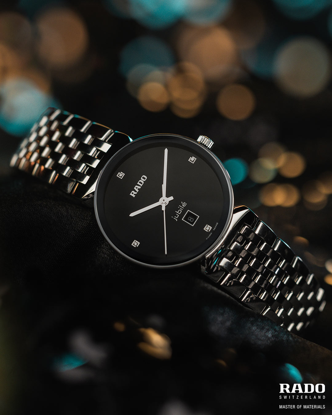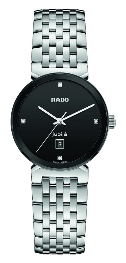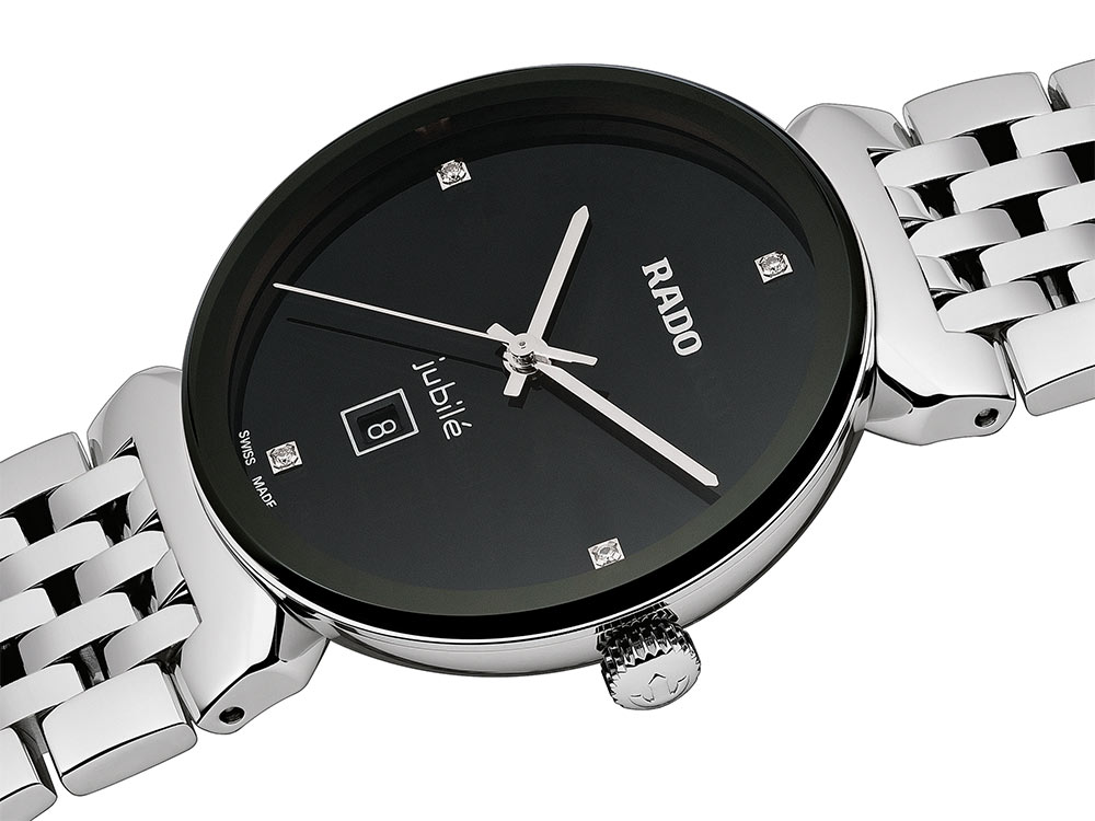 Tento nově interpretovaný 30milimetrový model se navíc vyznačuje štíhlým profilem a pasovým náramkem složeným ze sedmi řad. Nabízí vysokou flexibilitu a vysoký komfort nošení díky inovativnímu designu uší a vícesložkové konstrukci. Hodinky vám také umožní najít řadu nových designových prvků, které potěší i vytříbeným stylem provedení. Lakovaný černý ciferník s metalickým efektem dokonale ladí s leštěnou ocelovou lunetou se zkosenými a černě metalizovanými hranami, které jsou z vrchní strany skryty mírně vypouklým safírovým sklíčkem. Indikace pokovené rhodiem se pohybují mezi indexy 3/6/9/12 a čtyřmi broušenými diamanty. Jejich kvalitu a lesk zdůrazňuje a ctí opakující se slavné logo Jubilé na číselníku. Dříve se používaly k oddělení hodinek zdobených skutečnými prvotřídními diamanty od těch osazených syntetickými kameny. Dnes je toto stříbrné tištěné logo elegantním znamením pokračující afinity značky k prémiovým materiálům a designu. Hodinky jsou vybaveny quartzovým Machinekem Rado R079 s technologiemi PreciDrive a HeavyDrive pro vyšší přesnost a odolnost proti nárazům.