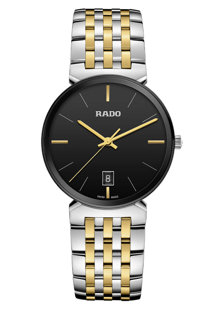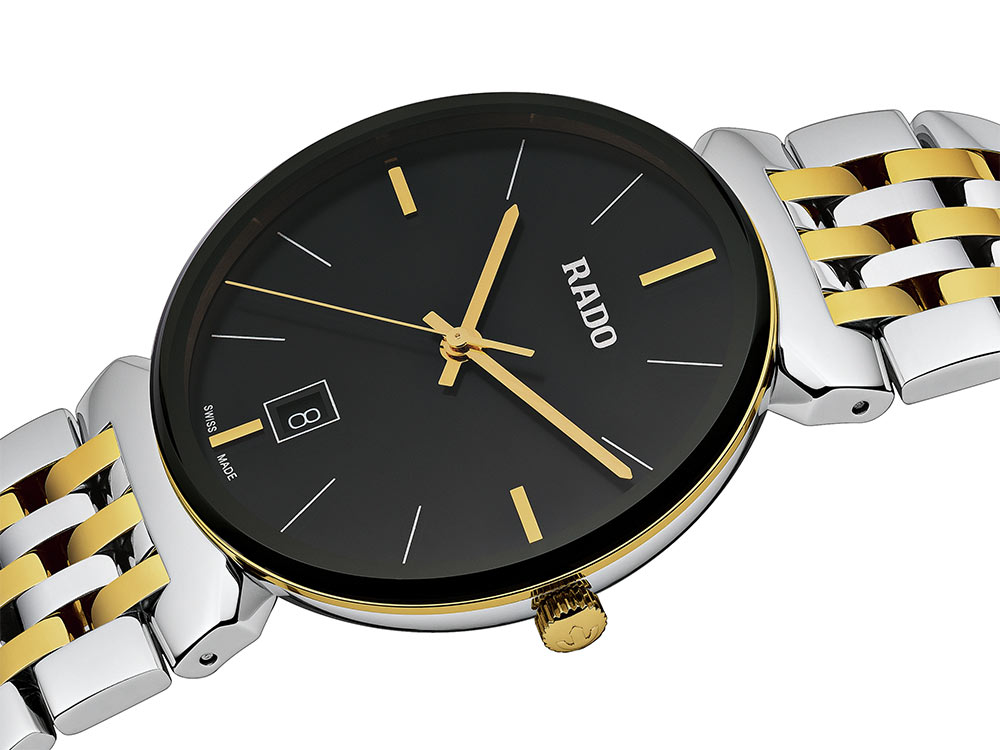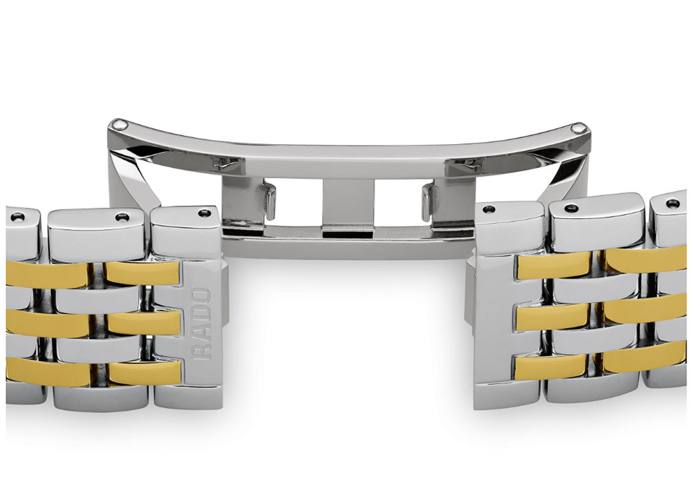 Tento reinterpretovaný 38milimetrový model se navíc vyznačuje štíhlým profilem a pasovým náramkem složeným ze sedmi řad, včetně těch potažených žlutým zlatem. Nabízí vysokou flexibilitu a vysoký komfort nošení díky inovativnímu designu uší a vícesložkové konstrukci. Hodinky vám také umožní najít řadu nových designových prvků, které potěší i vytříbeným stylem provedení. Černý ciferník s metalickým efektem dokonale ladí s leštěnou lunetou se zkosenými a černě metalizovanými hranami, které jsou z vrchní strany ukryty pod lehce vypouklým safírovým sklíčkem. Hodinky jsou vybaveny quartzovým Machinekem Rado R073 s technologiemi PreciDrive a HeavyDrive, které zaručují vyšší přesnost a odolnost proti nárazům.