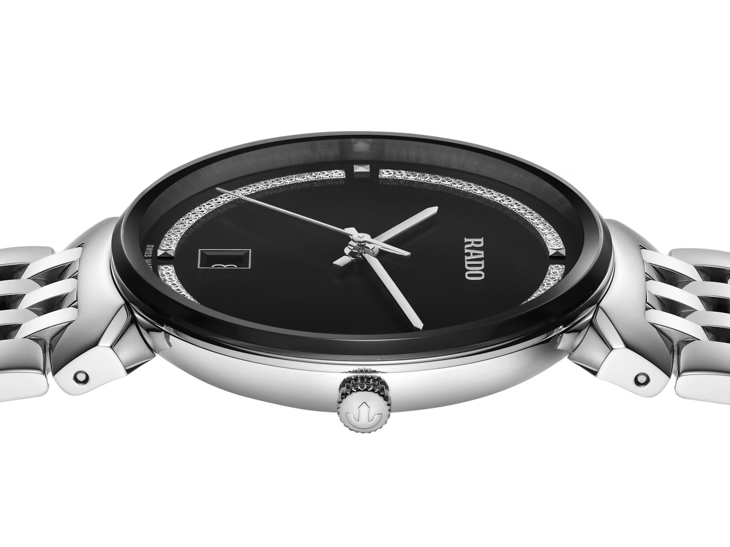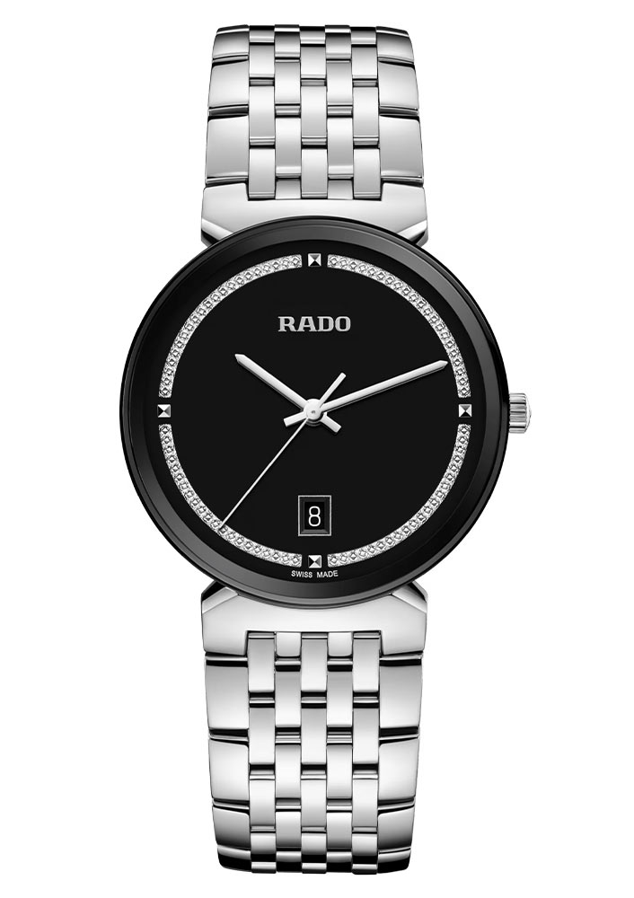Hodinky Rado byly navrženy pro snadné čtení času a pohodlné nošení. Orámováno širokým, k okraji mírně nakloněným, zakřiveným safírovým sklem o průměru 38 mm, dokonale chrání jeho půvabný ciferník. Jeho leštěné pouzdro, korunka, luneta a zadní strana jsou vyrobeny z nerezové oceli, díky čemuž jsou pevné a odolné. Náramek z leštěné nerezové oceli dokonale ladí s celými hodinkami a vytváří tak ucelený a elegantní celek. Černý ciferník zdobený jemným rhodiovaným třpytivým zdobením vyniká zvýrazněným stříbrným logem „Rado“, které mu dodává výjimečnou prestiž. Rhodiované ručičky dokonale kontrastují s pozadím a umožňují tak snadno odečítat čas i v obtížnějších světelných podmínkách.