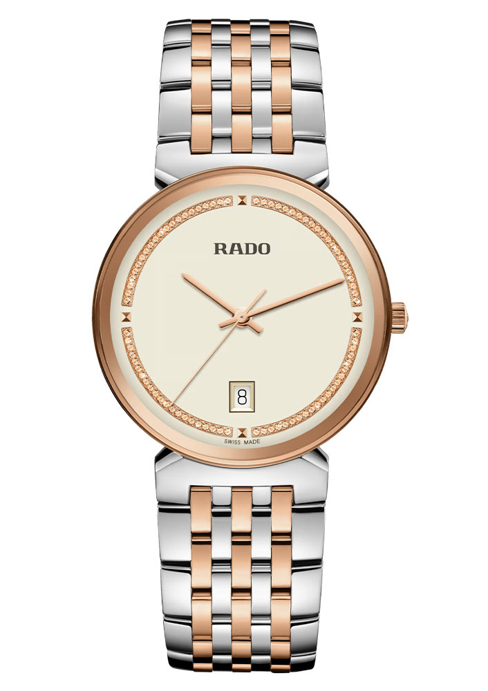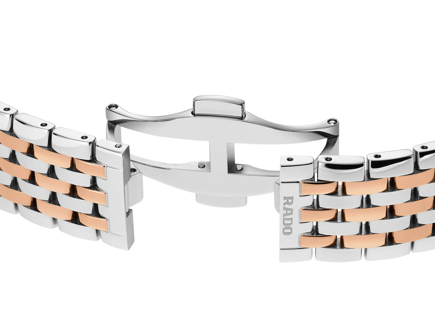Hodinky Rado byly navrženy pro snadné čtení času a pohodlné nošení. Orámováno širokým, k okraji mírně nakloněným, zakřiveným safírovým sklem o průměru 38 mm, dokonale chrání jeho půvabný ciferník. Jeho leštěné pouzdro, korunka, luneta a zadní strana jsou vyrobeny z nerezové oceli ve stříbrné a růžové zlaté barvě, díky čemuž jsou pevné a odolné. Dvoubarevný náramek z leštěné nerezové oceli dokonale ladí s celými hodinkami a vytváří tak ucelený a elegantní celek. Ciferník šampaňského zdobený jemným rhodiovaným třpytivým zdobením vyniká zvýrazněným stříbrným logem „Rado“, které mu dodává výjimečnou prestiž. Rhodiované ručičky dokonale kontrastují s pozadím a umožňují tak snadno odečítat čas i v obtížnějších světelných podmínkách.