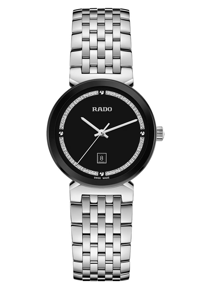 Hodinky orámované širokým, k okraji mírně nakloněným, zakřiveným safírovým sklem o průměru 30 mm, dokonale chrání svůj půvabný ciferník. Jeho leštěné pouzdro, korunka, luneta a zadní část pouzdra jsou vyrobeny z nerezové oceli, díky čemuž jsou pevné a odolné. Náramek z leštěné nerezové oceli dokonale ladí s celkovým vzhledem těchto klasických hodinek a vytváří ucelený a elegantní celek. Černý ciferník zdobený jemným rhodiovaným třpytivým zdobením vyniká zvýrazněným stříbrným logem „Rado“, které mu dodává výjimečnou prestiž. Rhodiované ručičky dokonale kontrastují s pozadím a umožňují tak snadno odečítat čas i v obtížnějších světelných podmínkách.